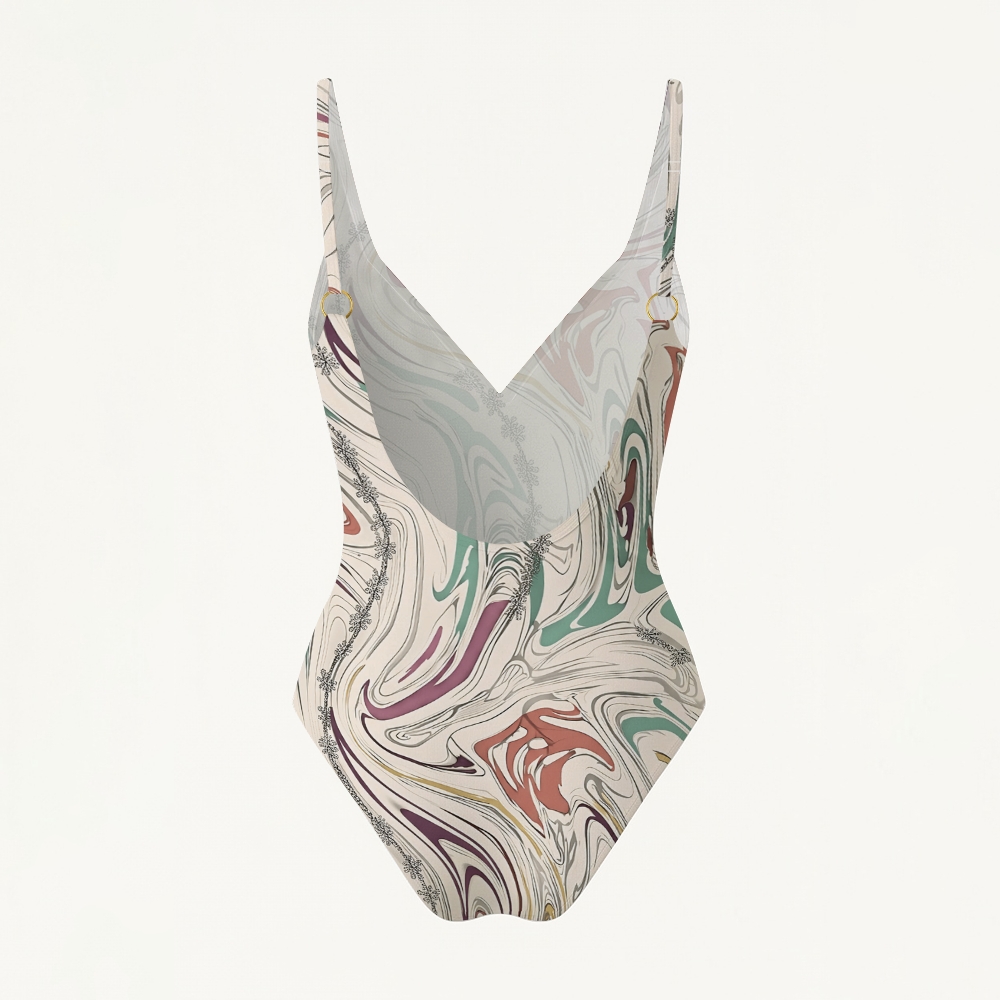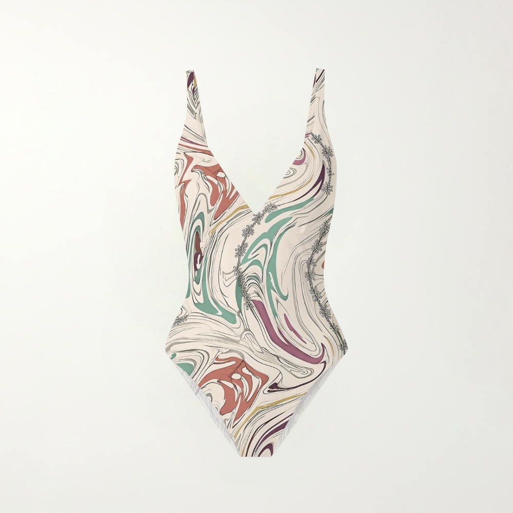 Fluid Art Print Deep V Low Back One Piece Swimsuit