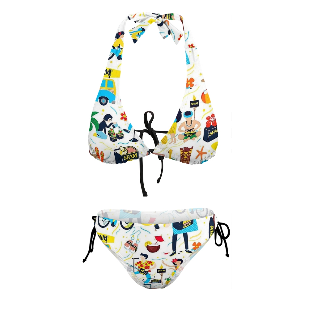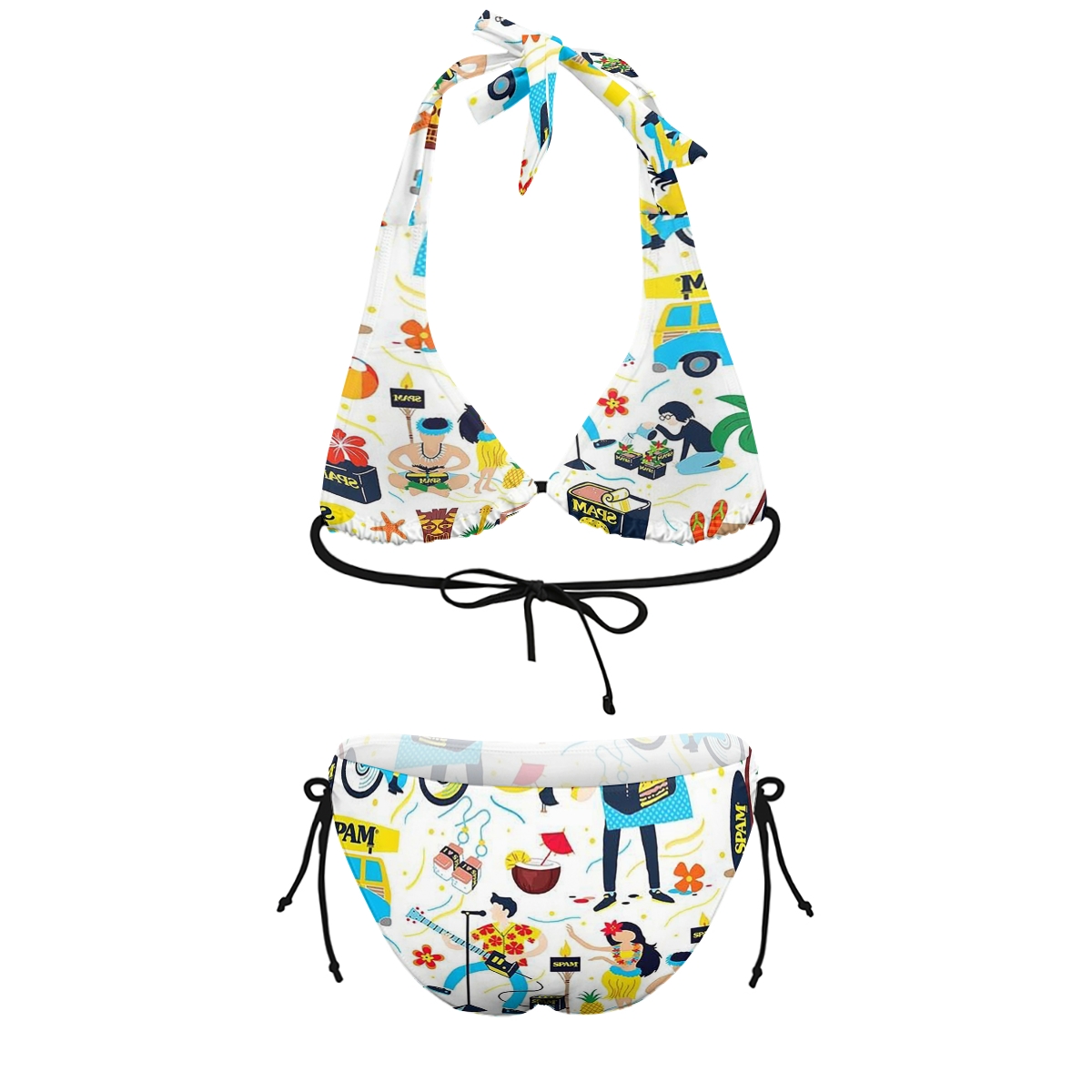 Hawaiian Retro Cartoon Print Triangle Cup Deep V Halter Bikini