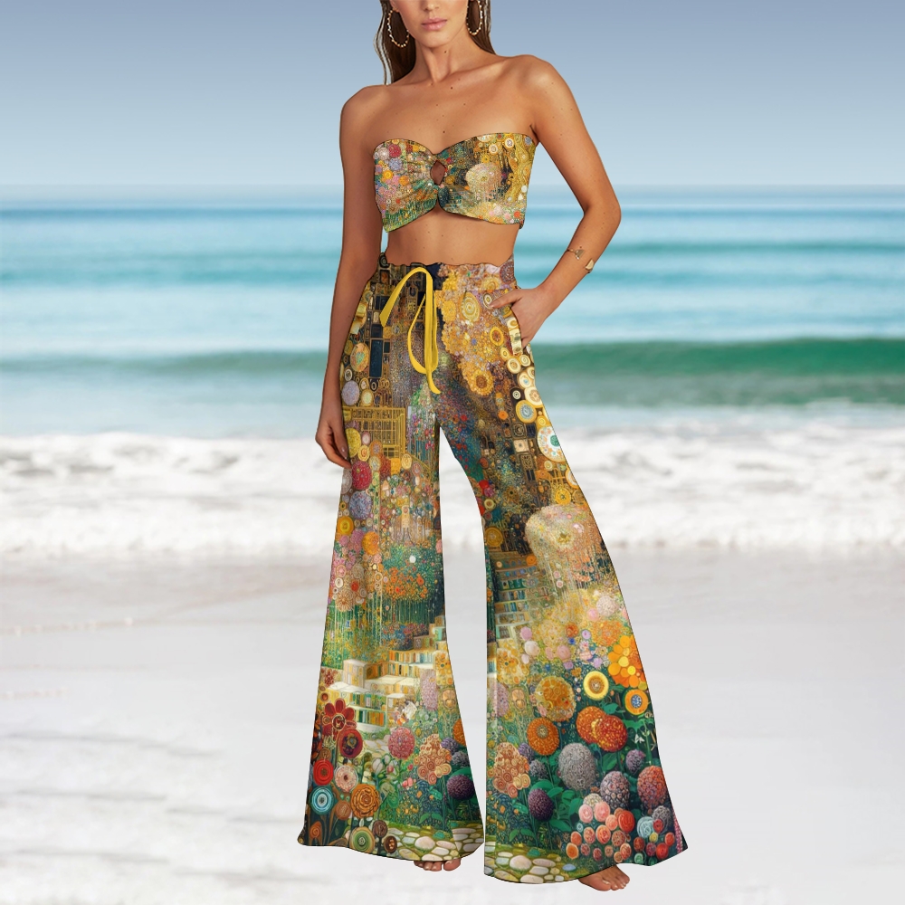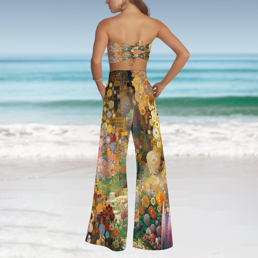 Klimt Inspired Art Bandeau Three Piece Bikini Set with Matching Wide Leg Pants