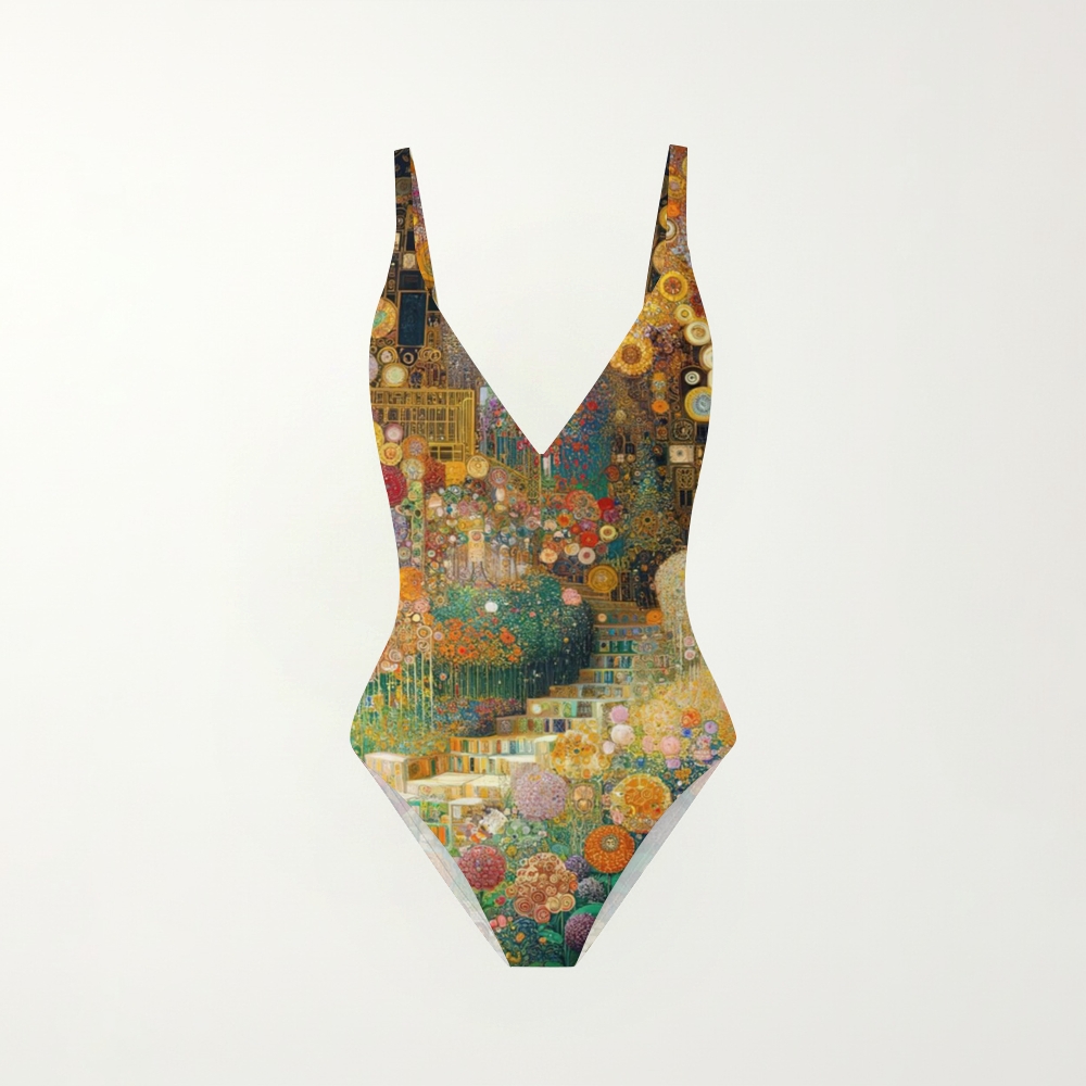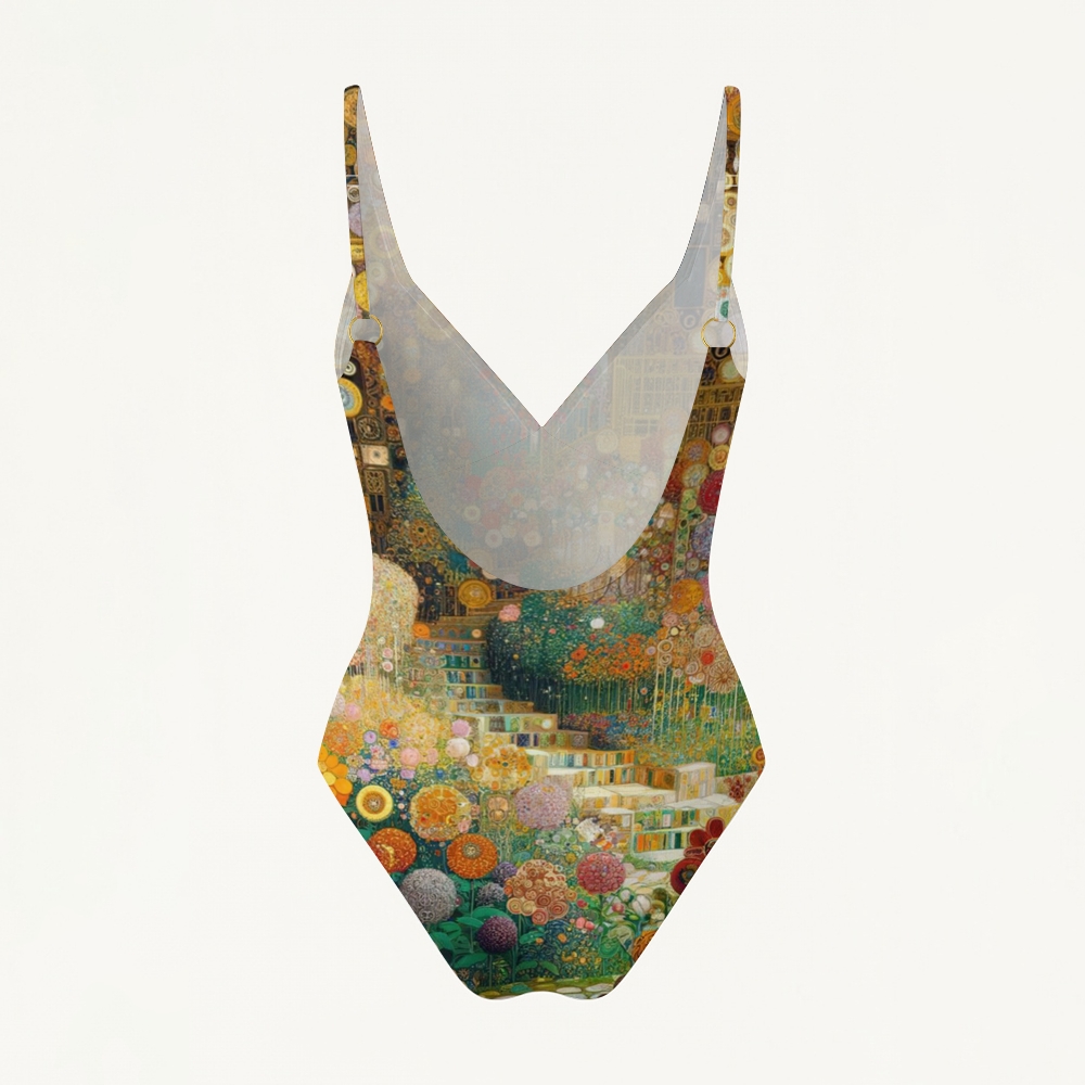Klimt Inspired Art V Neck Backless One Piece Swimsuit