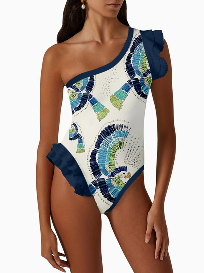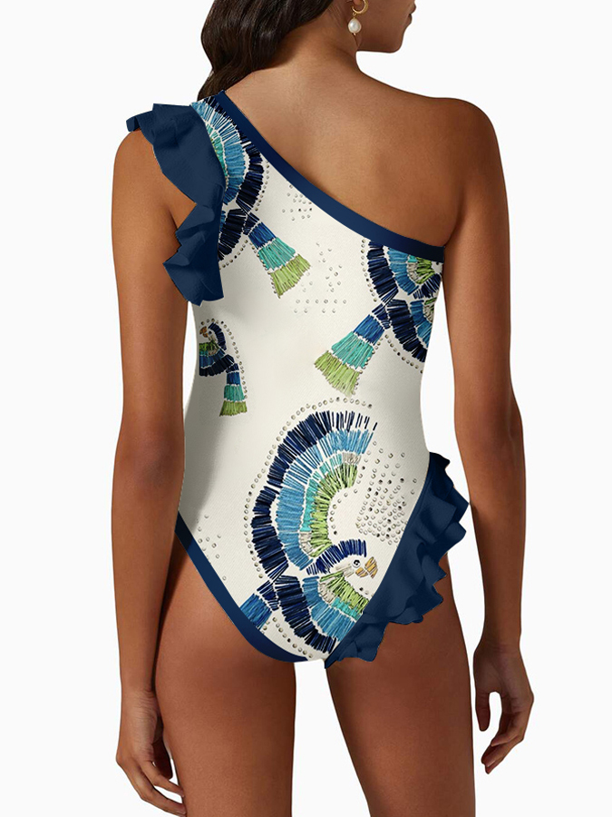 One-Shoulder Ruffle Print One-Piece Swimsuit Set