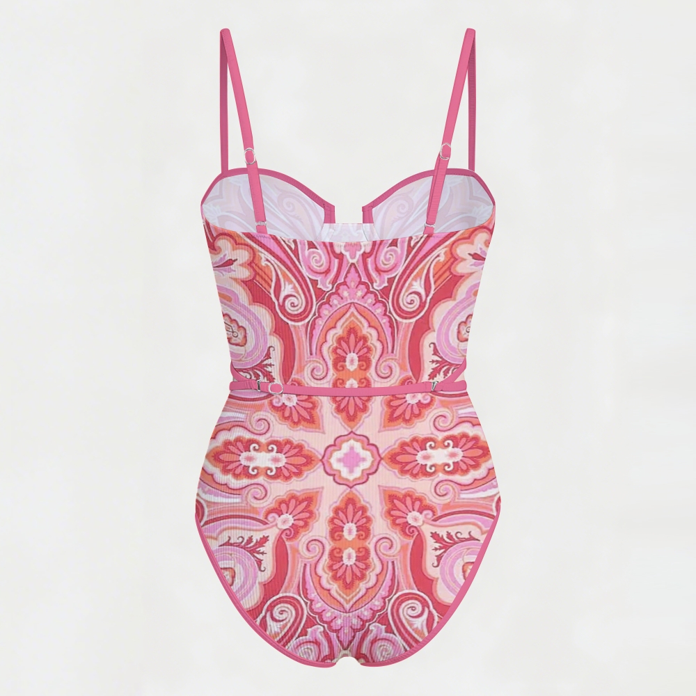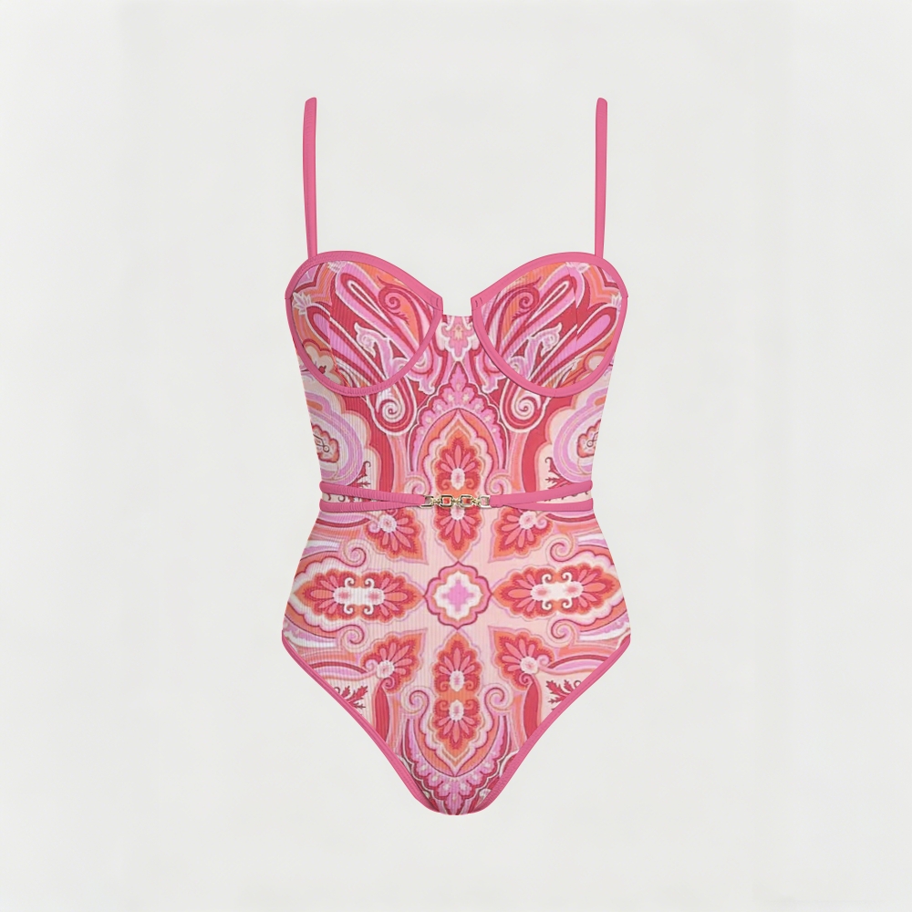 Paisley Print Underwire Belted One Piece Swimsuit