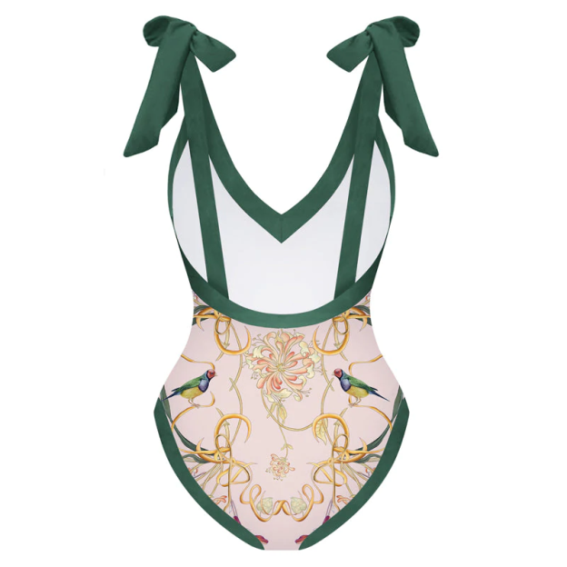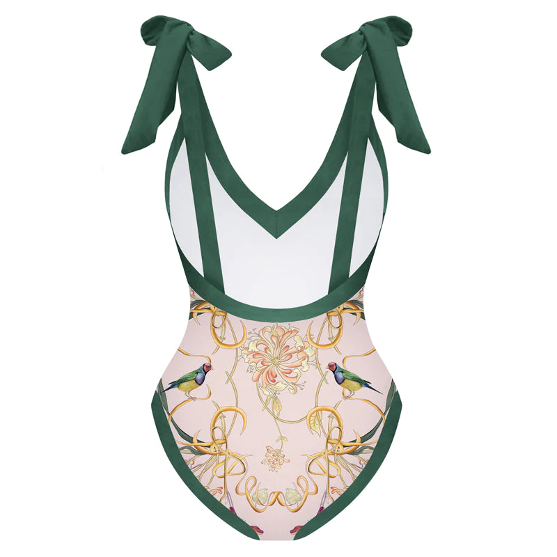 Printed One Piece Bowknot Tie-shoulder Swimsuit and Cover Up