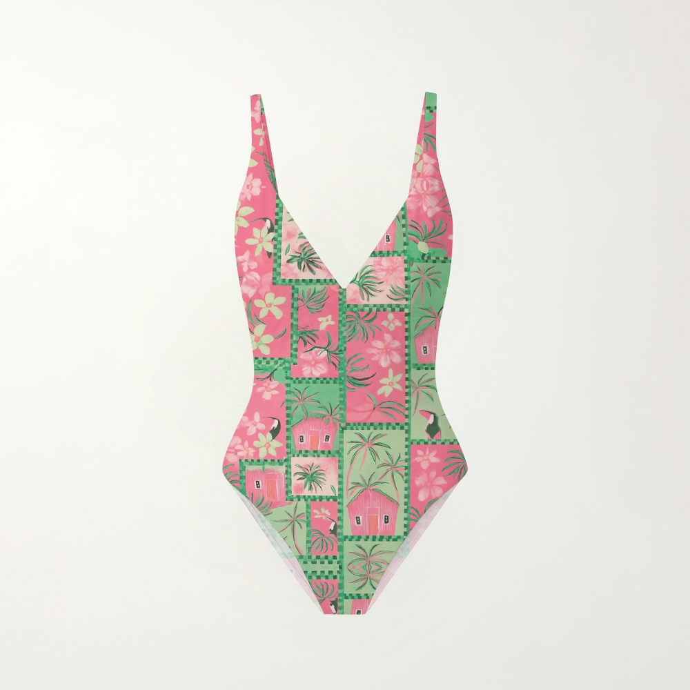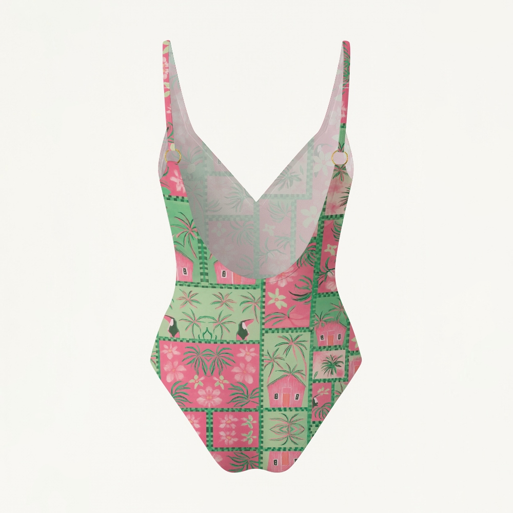 Tropical Toucan Floral Print V-Neck Backless One-Piece Swimsuit