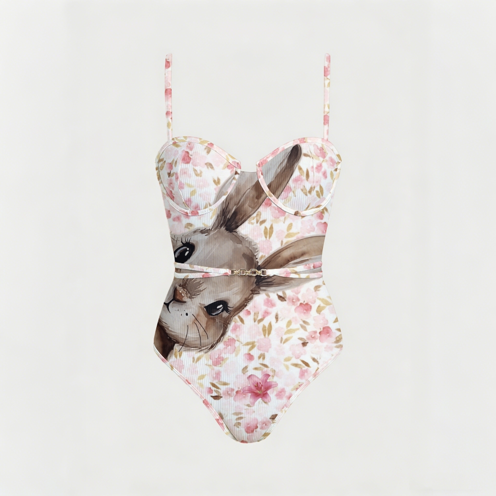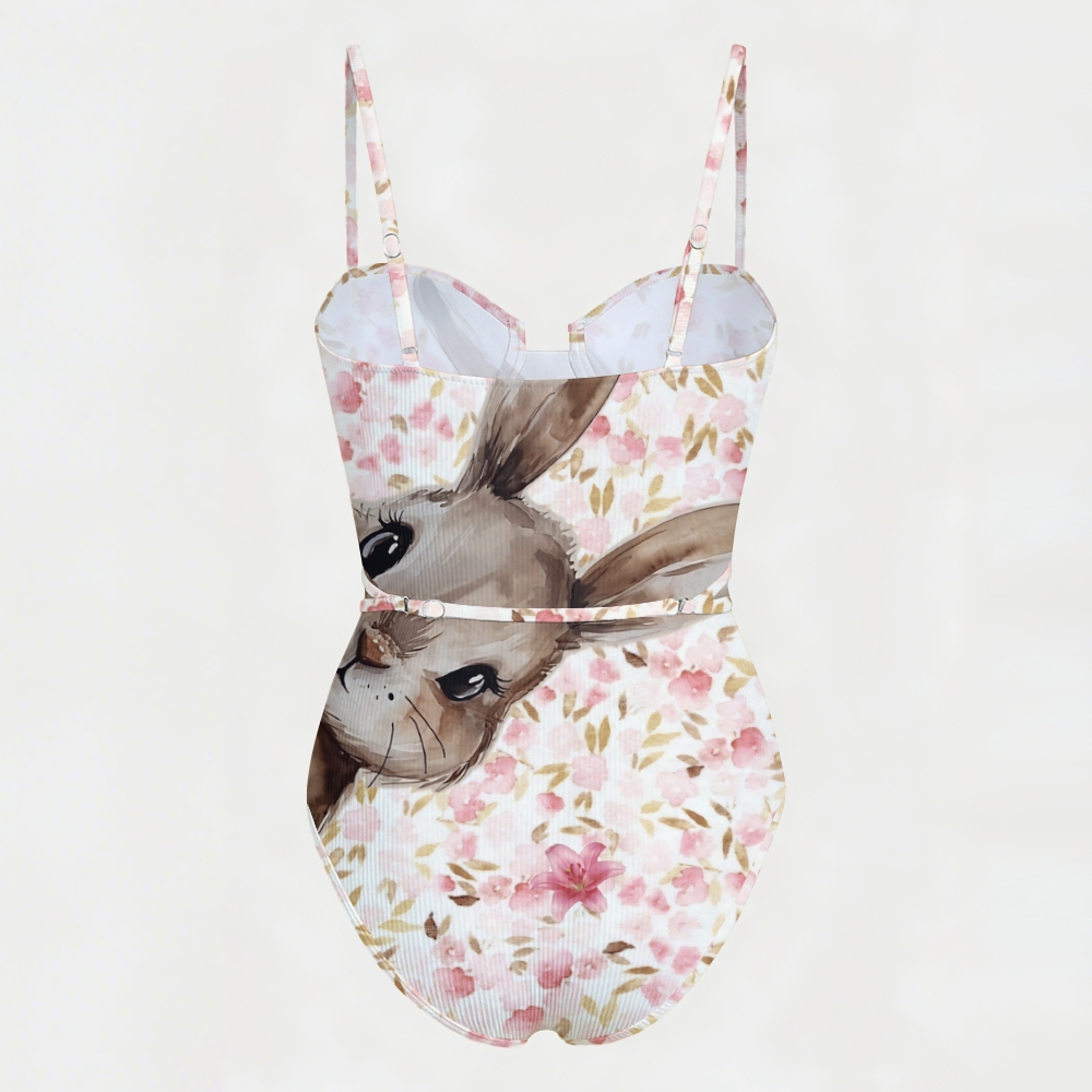 Watercolor Rabbit & Cherry Blossom Print Underwire Belted One Piece Swimsuit