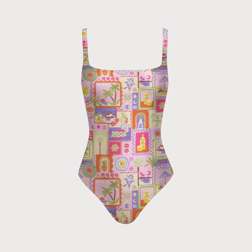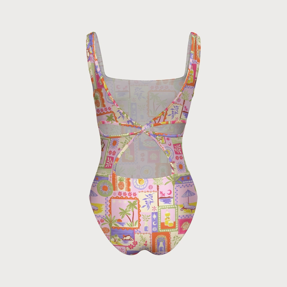 Women's Tropical Collage Print One-piece Swimsuit With Back Mesh Knot
