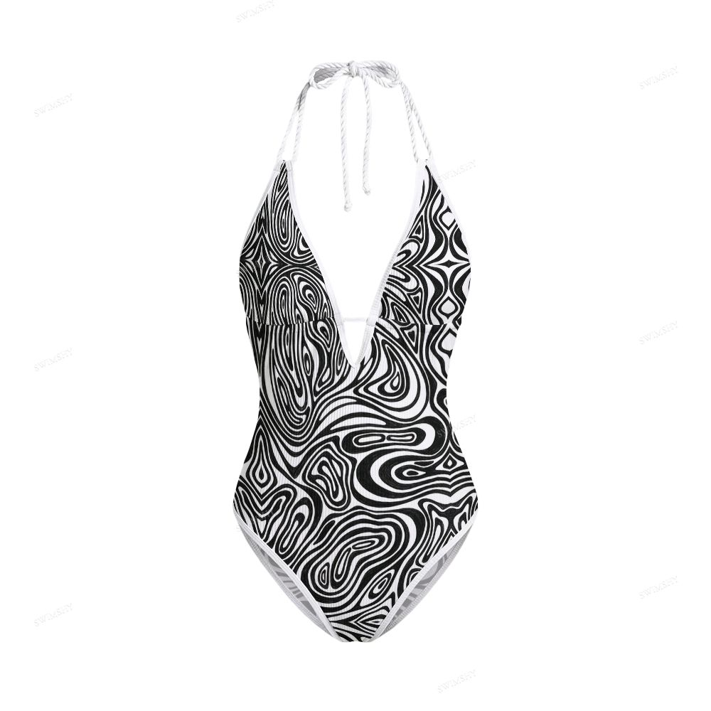 Abstract Black & White Marble Print Contrast V Neck One-Piece Swimsuit