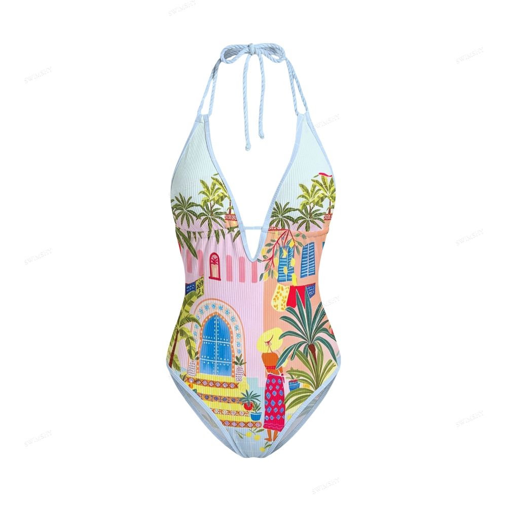 Colorful Resort Print Contrast V Neck One-Piece Swimsuit