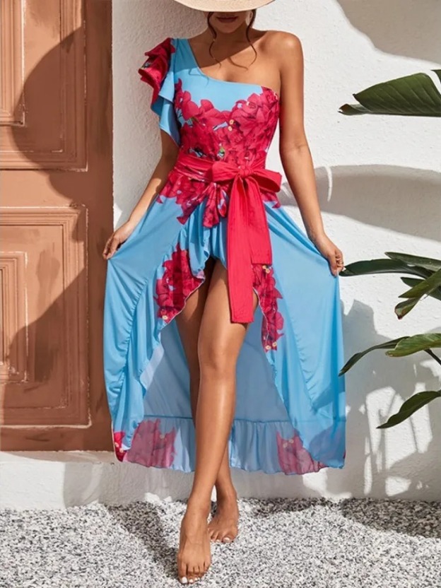 Fashion Floral Print Ruffle Colorblock One-Piece Swimsuit