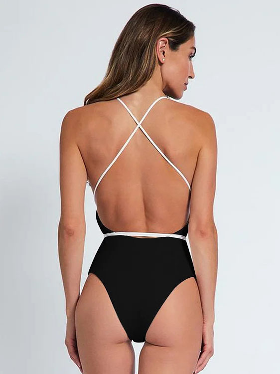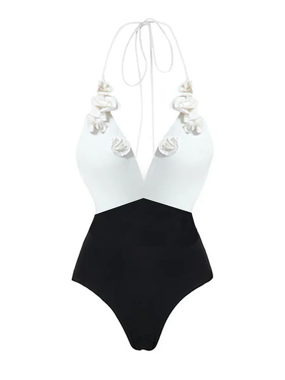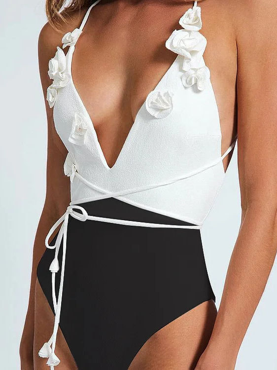 French Retro Black White 3D Floral Deep V Neck Cross Back One Piece Swimsuit