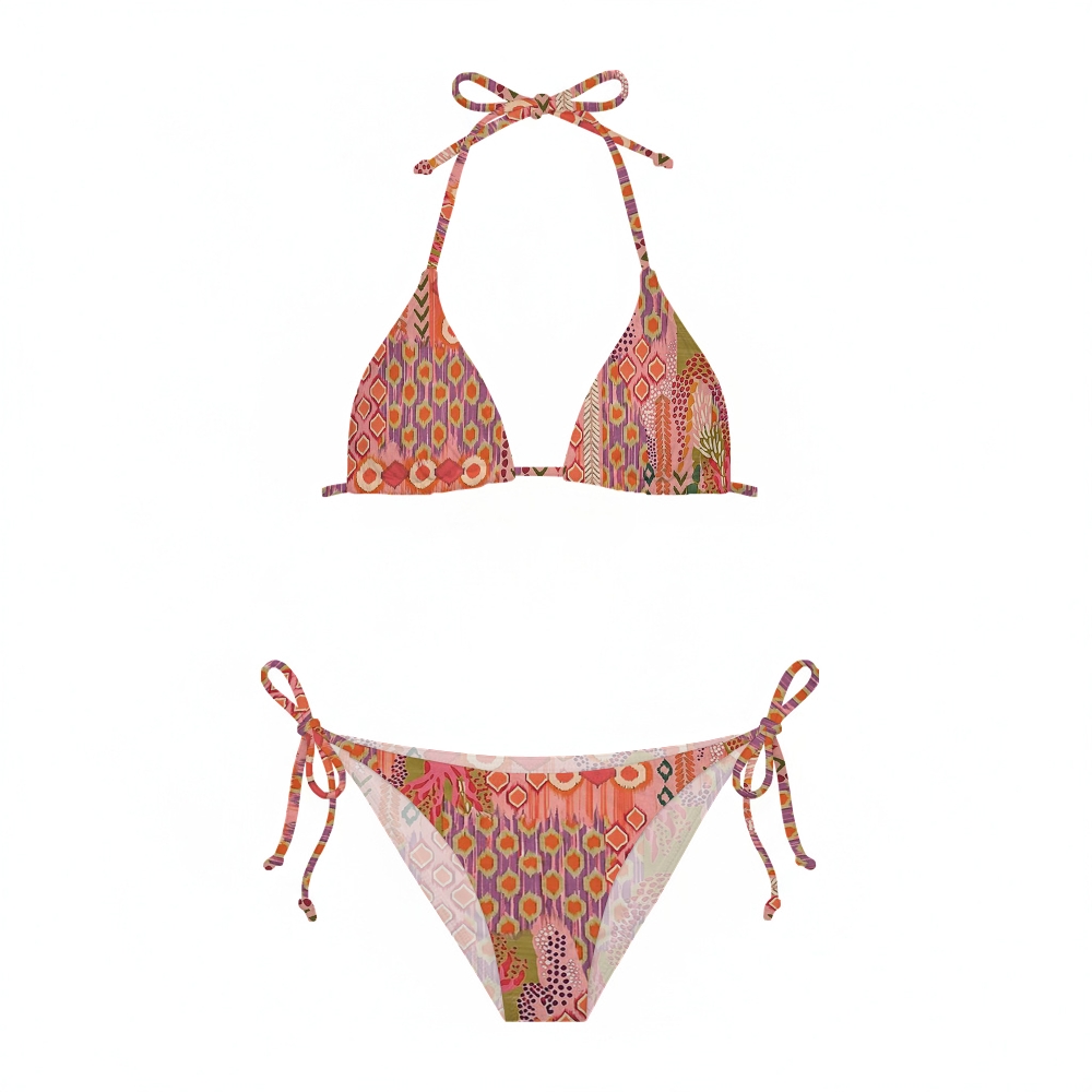 Ikat Style Tropical Plant Print Halter Triangle Top Bikini