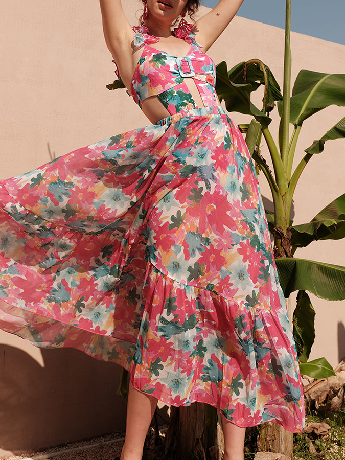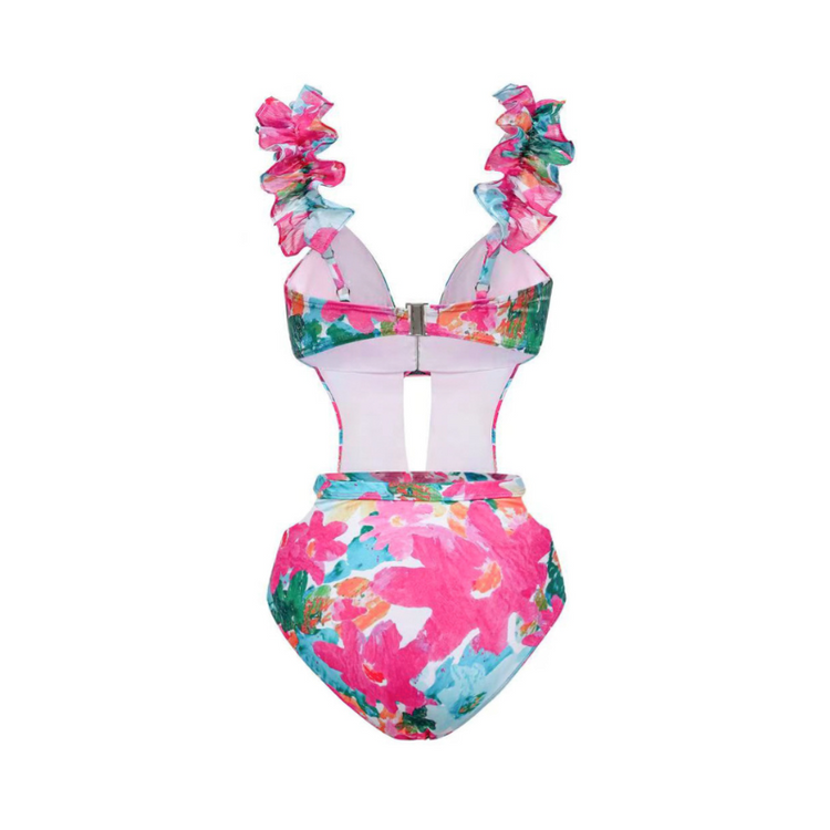 Lace Cutout Rose Red Floral One Piece Swimsuit And Skirt