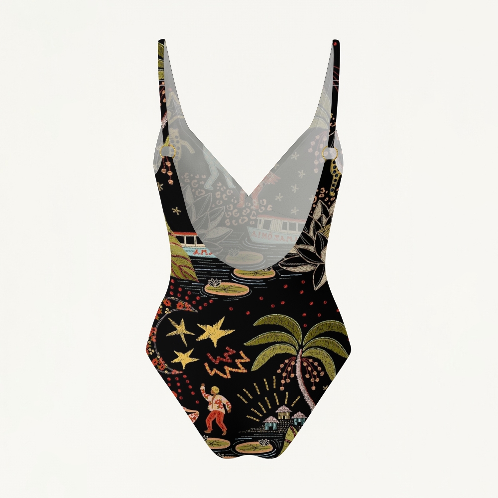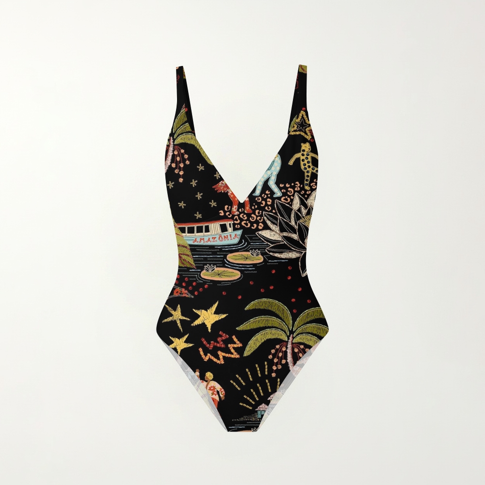 Leopard & Ethnic Figure Print Plunging V-Back One-Piece Swimsuit