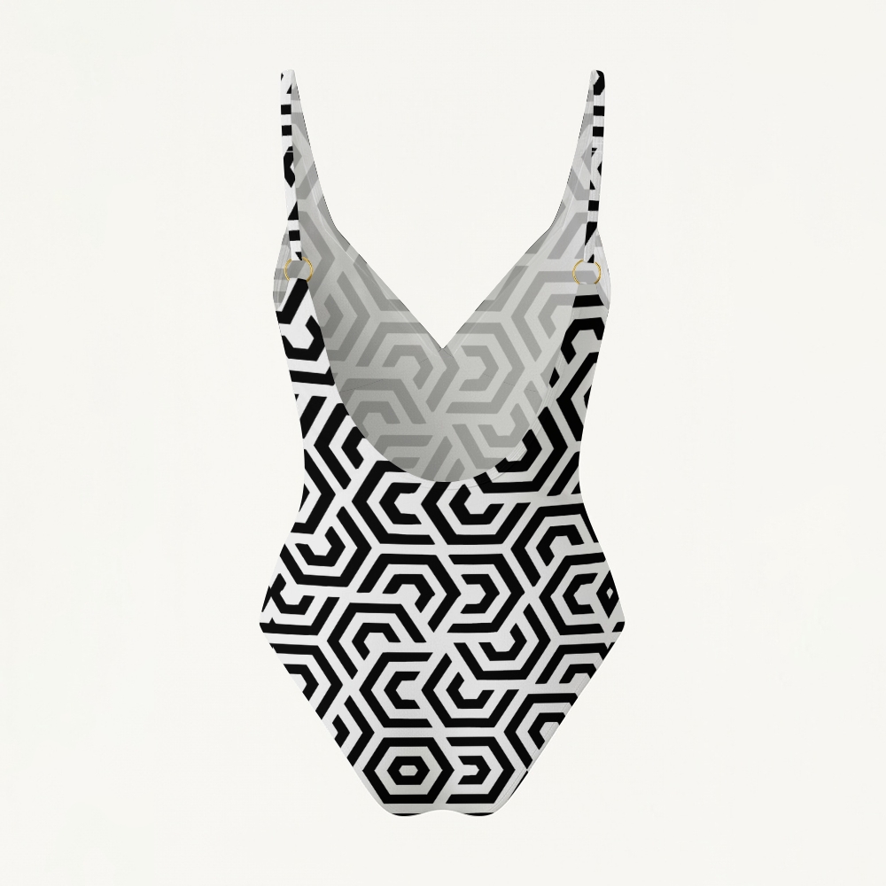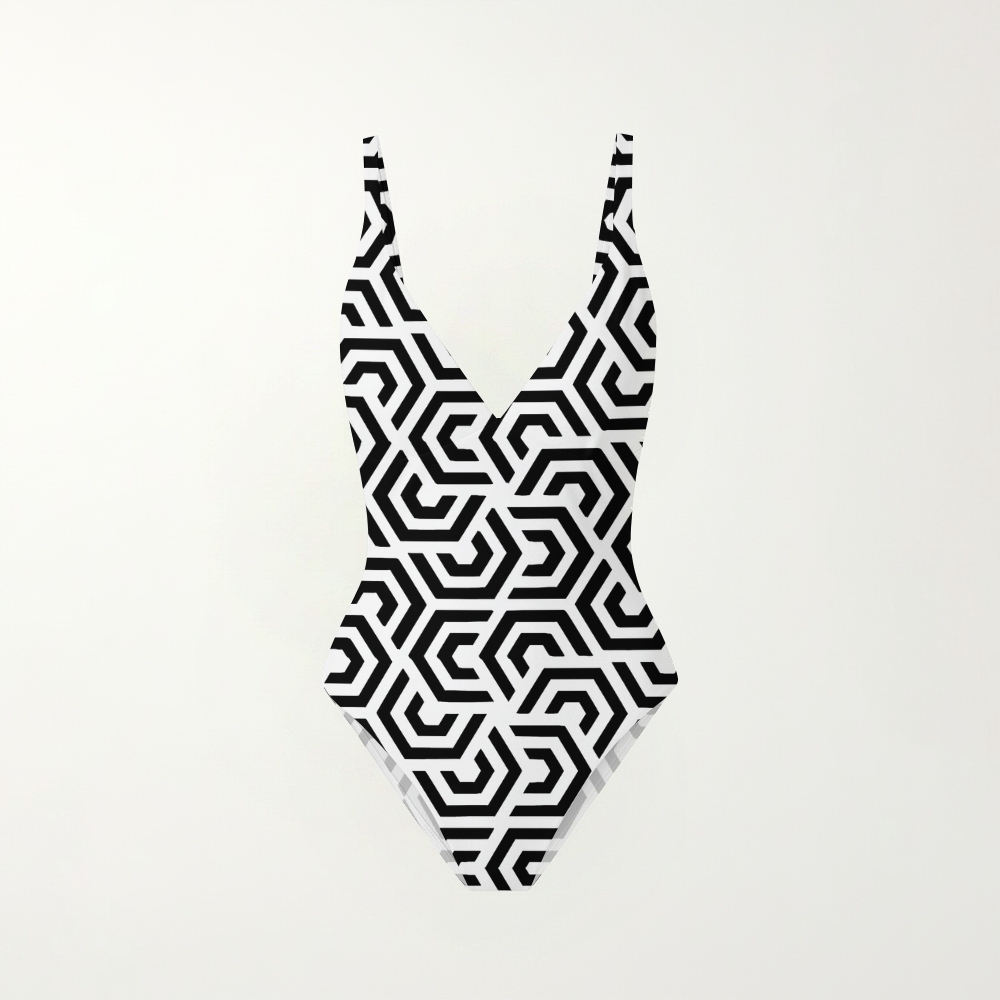 Modern Geometric Maze Print Deep V Low Back One Piece Swimsuit
