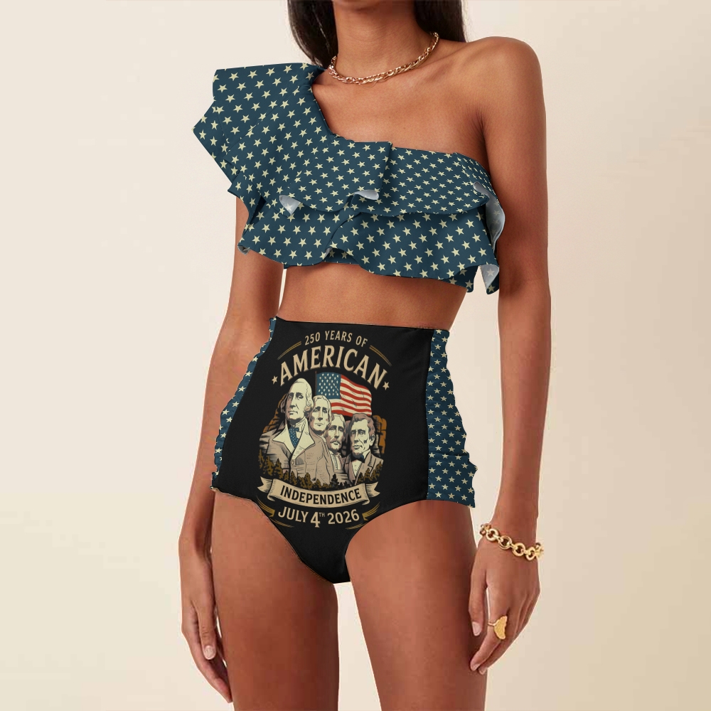 Mount Rushmore 250th Independence Print One-Shoulder Ruffled Swimsuit Set