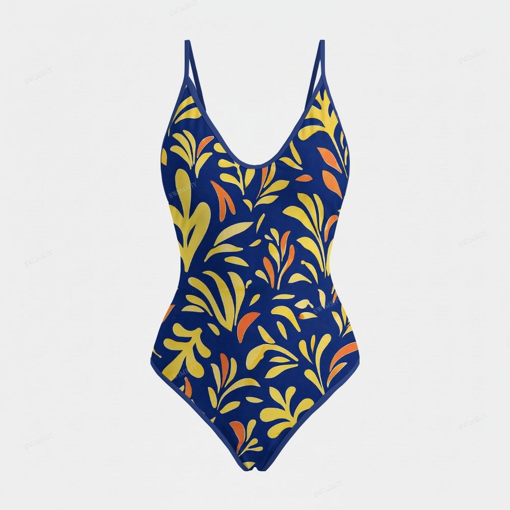 Navy Blue Tropical Plant Print Deep V Backless One Piece Swimsuit