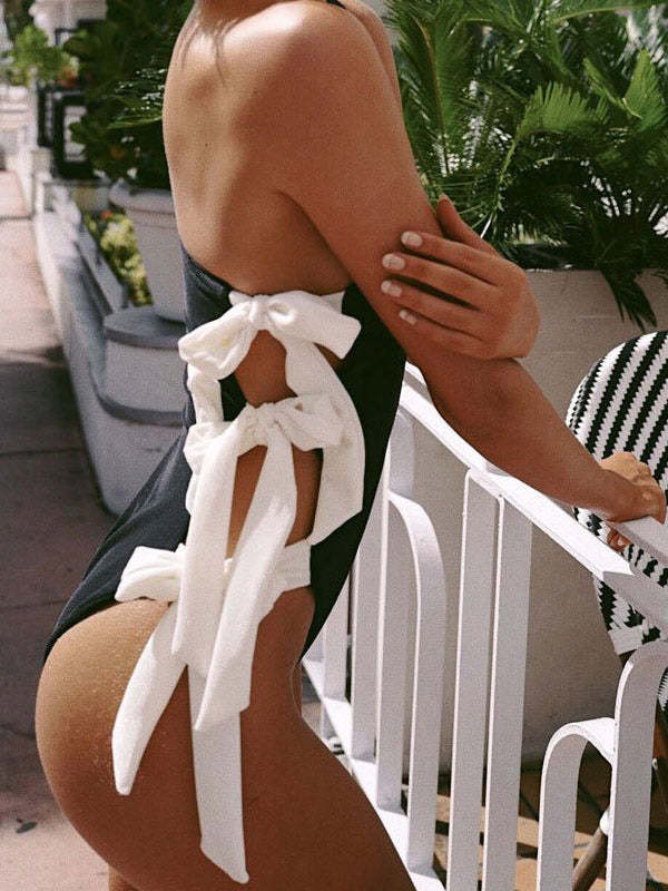 One-Shoulder Solid Bowknot One-Piece Swimsuit
