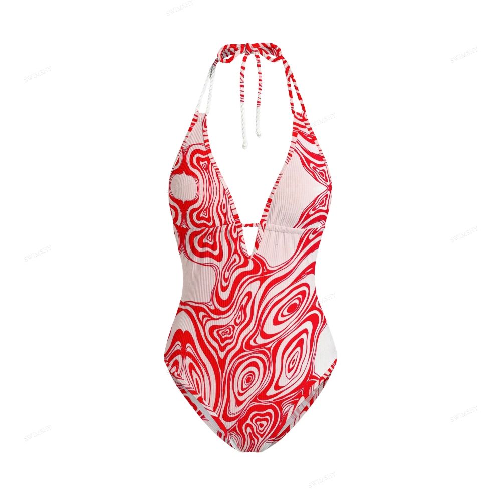Psychedelic Red White Swirl Motif Contrast V Neck One-Piece Swimsuit