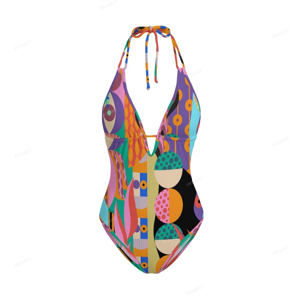 Retro Geometric Contrast V Neck One-Piece Swimsuit