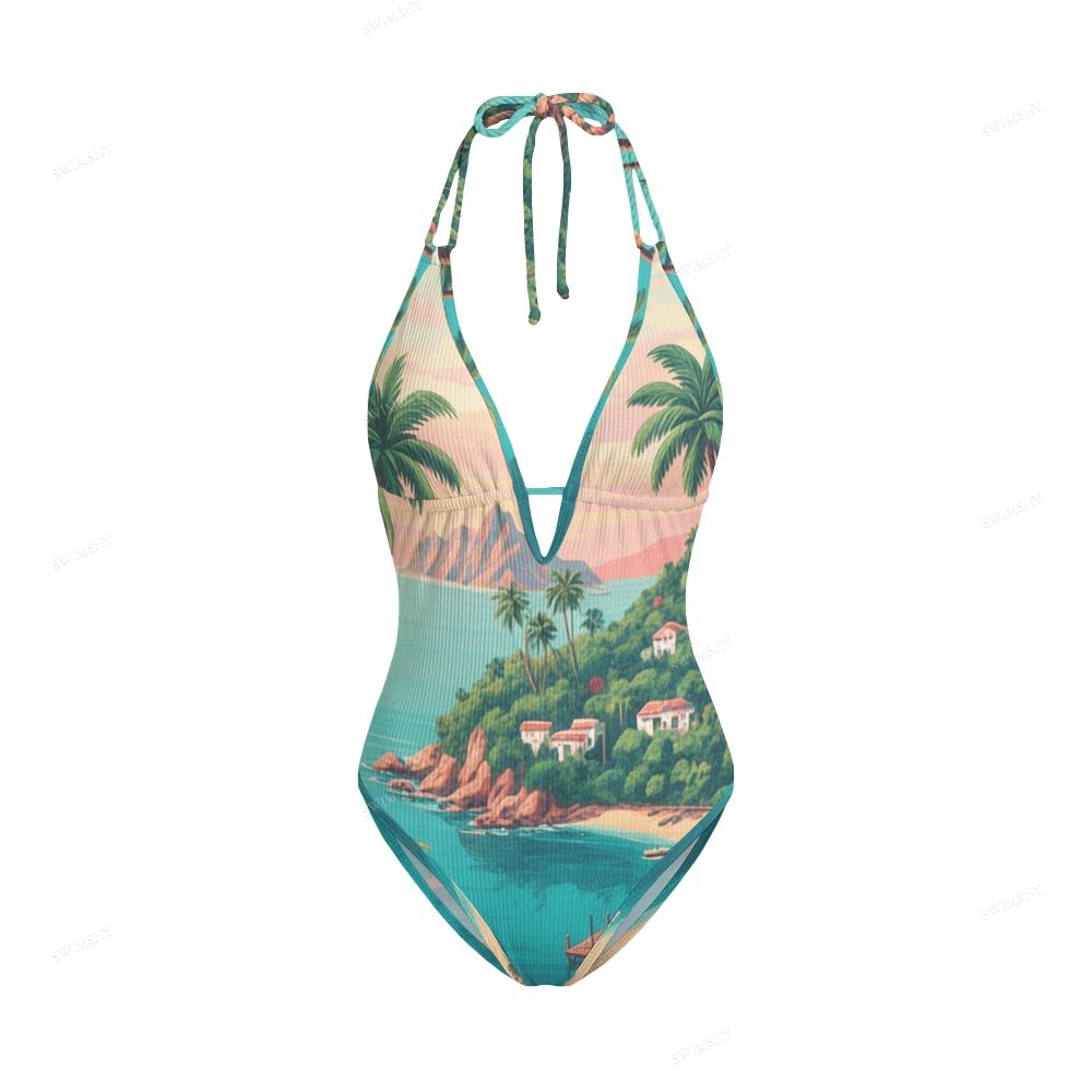 Tropical Island Print Contrast V Neck One-Piece Swimsuit