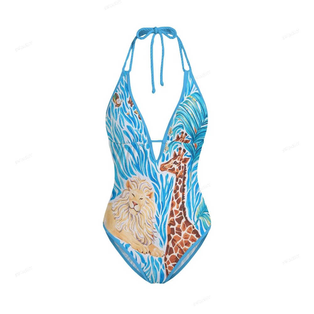 Tropical Jungle Lion Giraffe Print Halter Tie Deep V One Piece Swimsuit