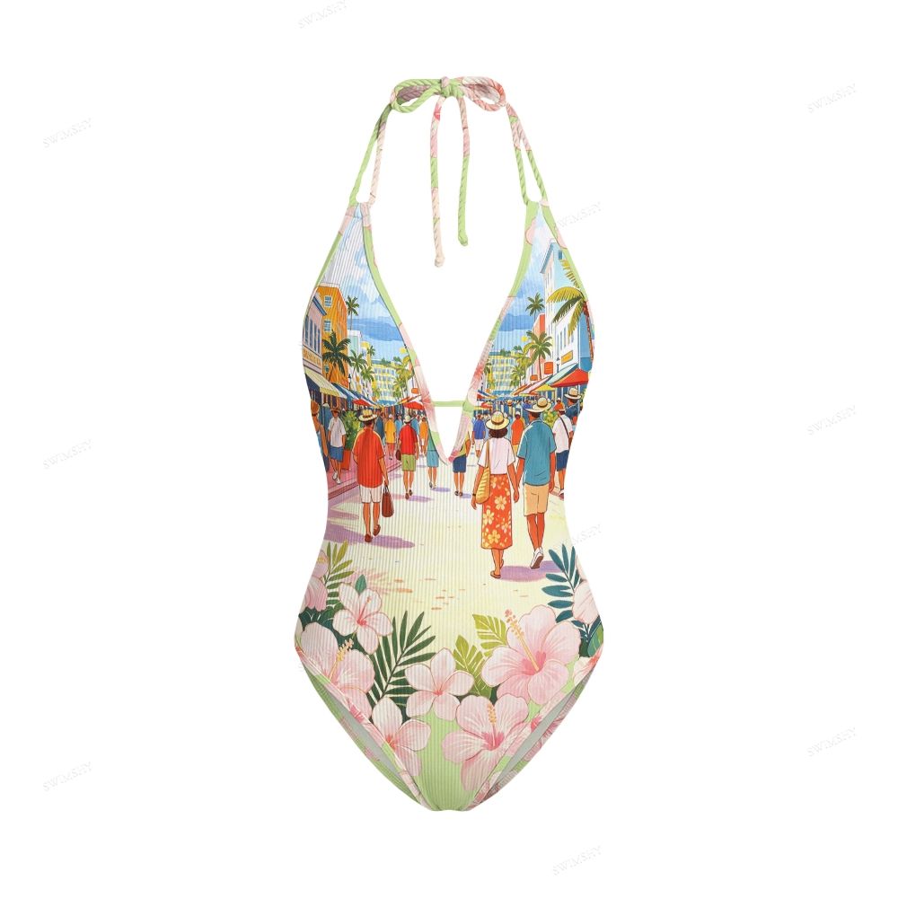 Tropical Street Print Contrast V Neck One-Piece Swimsuit