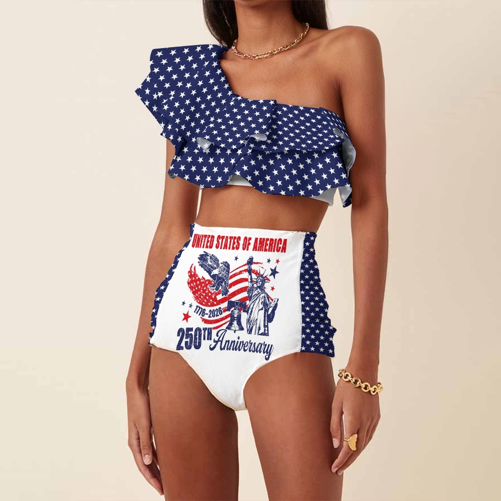 USA 250th Anniversary Patriotic Print One-Shoulder Ruffled Swimsuit Set