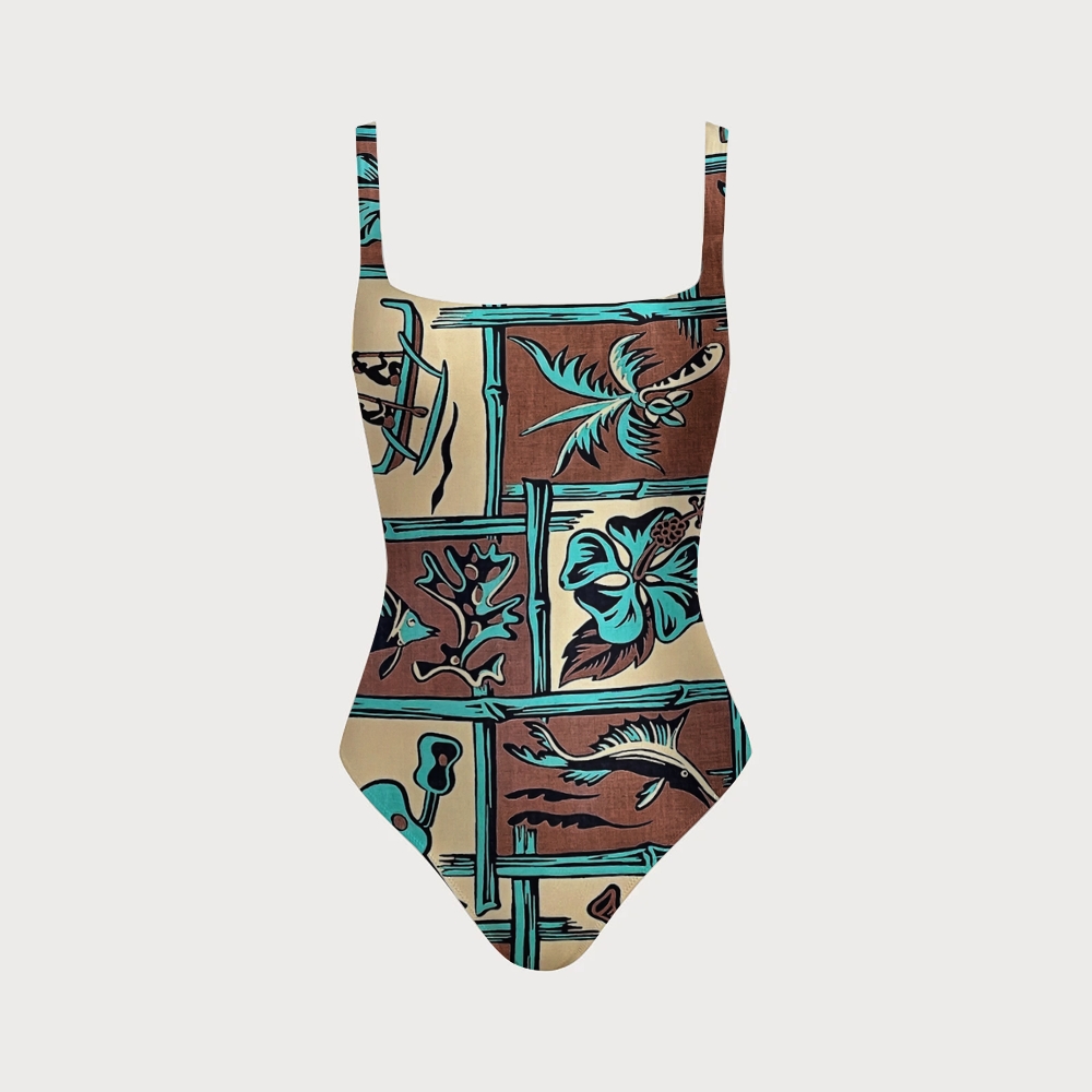 Vintage Hawaiian Tropical Square Neck Cutout One Piece Swimsuit