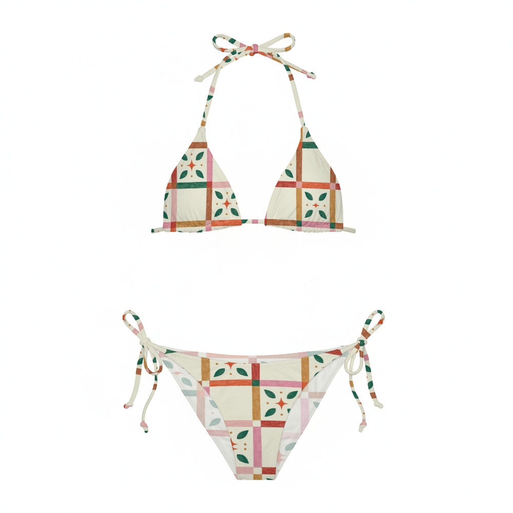 Vintage Pastoral Plaid Floral Halter Triangle Bikini