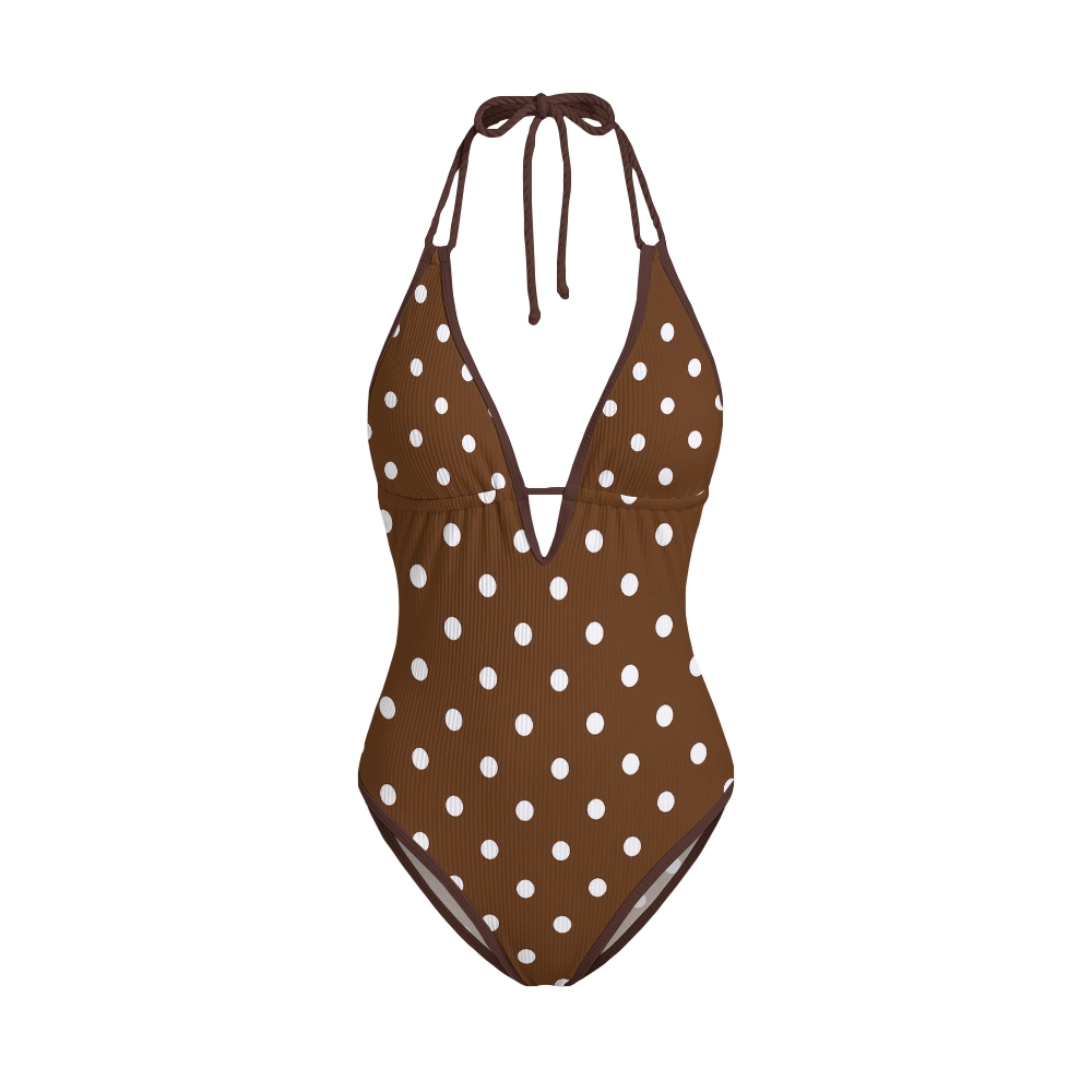 Vintage Polka Dot Halter Deep V Backless Lace-up One-Piece Swimsuit