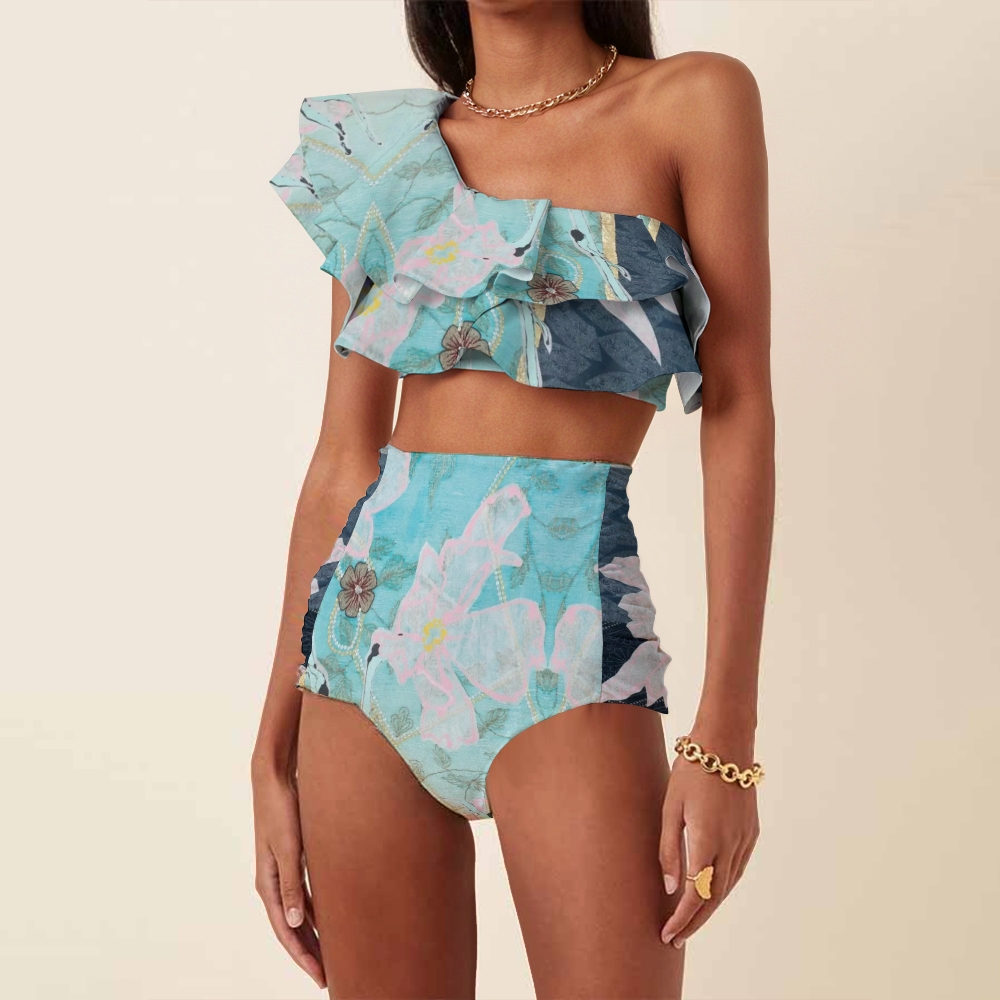 Watercolor Floral Beaded Print One-Shoulder Ruffled Swimsuit Set