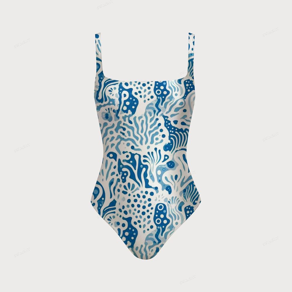 Women's Blue Coral Print One-piece Swimsuit With Back Mesh Knot