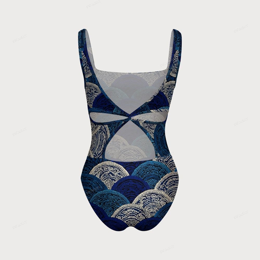 Women's Indigo Scallop Print One-piece Swimsuit With Back Mesh Knot