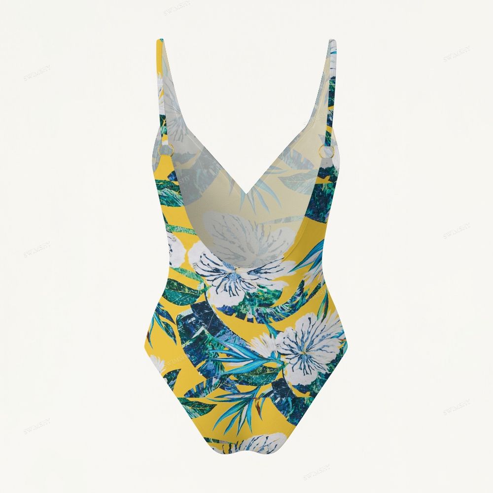 Yellow Tropical Floral Print Low Back One Piece Swimsuit