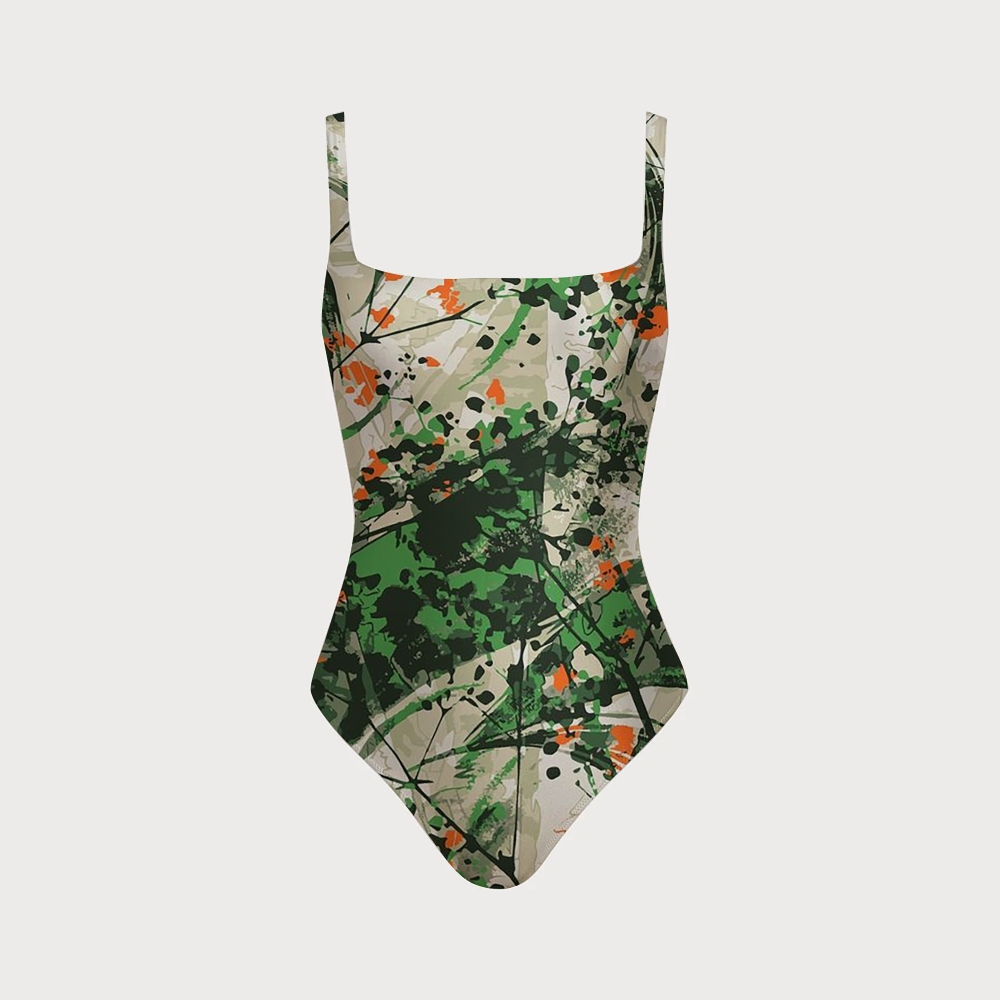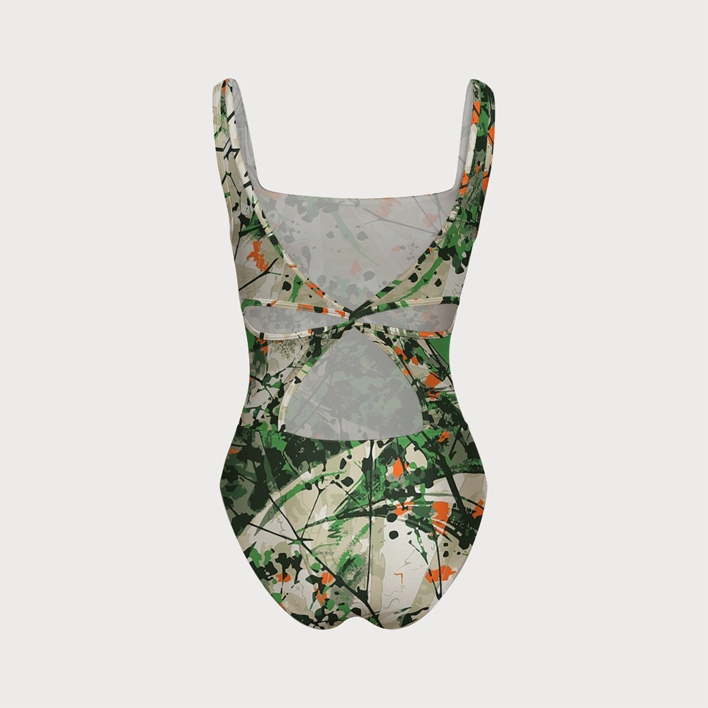 Abstract Ink Floral Print Square Neck Backless One Piece Swimsuit