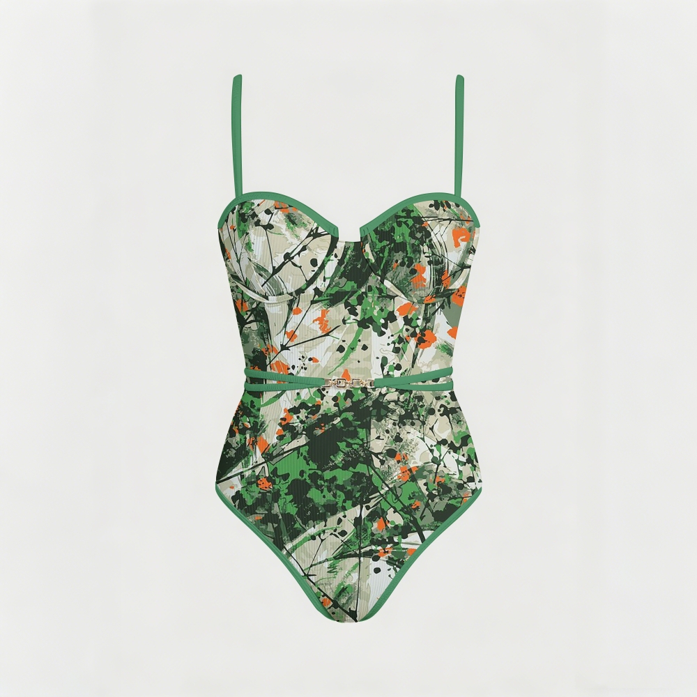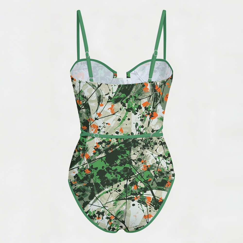 Abstract Ink Floral Print Strap Waist Tie One Piece Swimsuit
