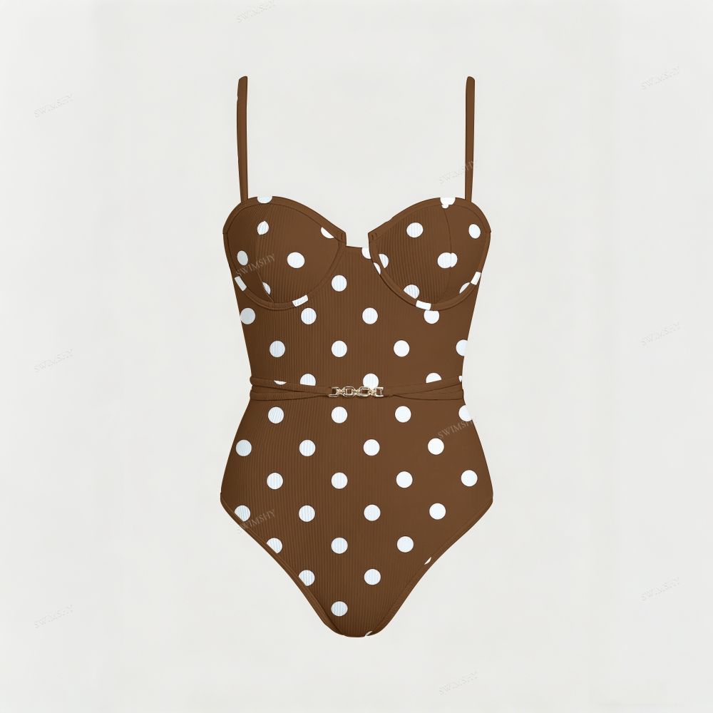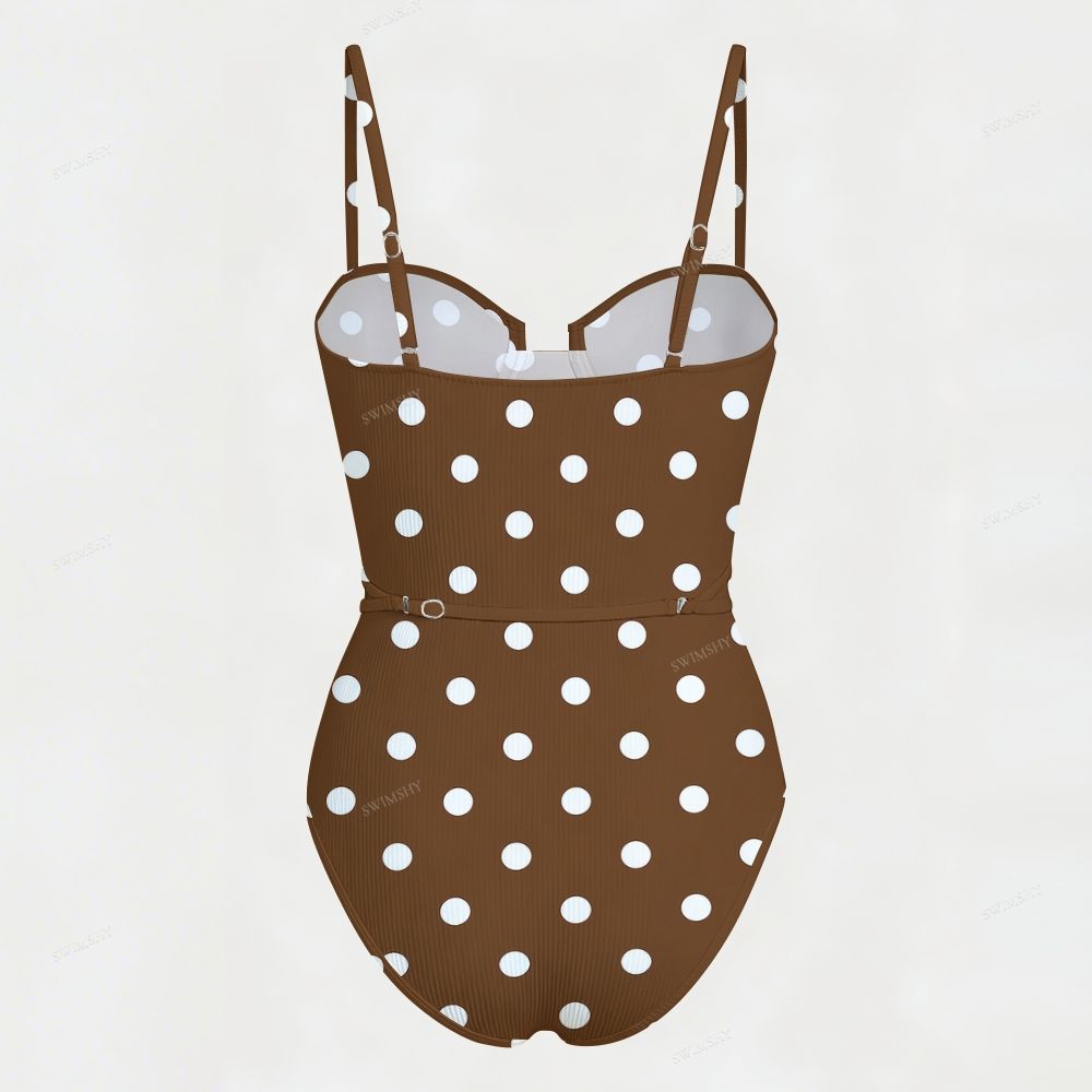 Brown White Polka Dot Underwire Belted One Piece Swimsuit