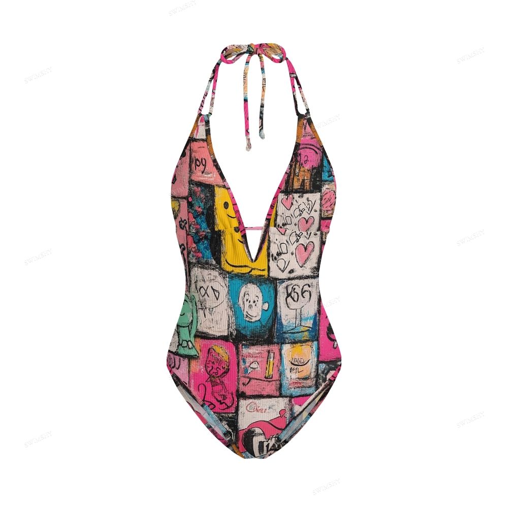 Colorful Graffiti Block Halter One Piece Swimsuit