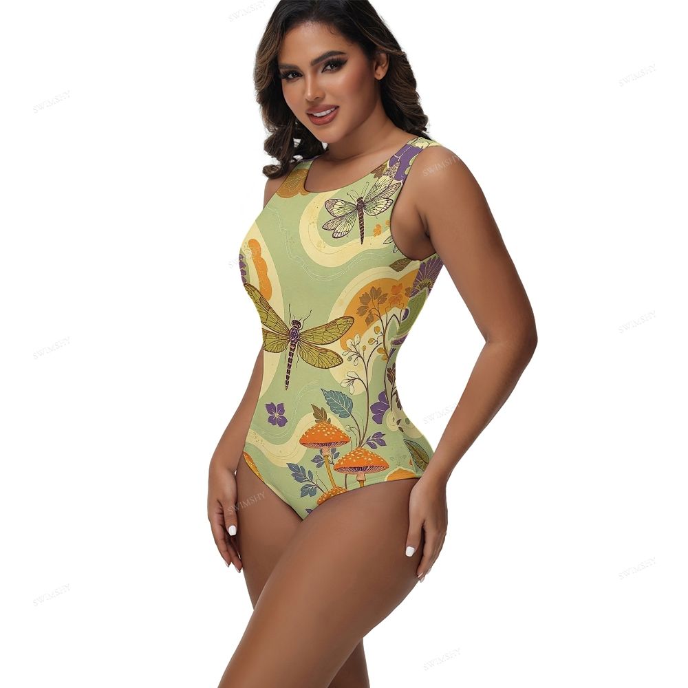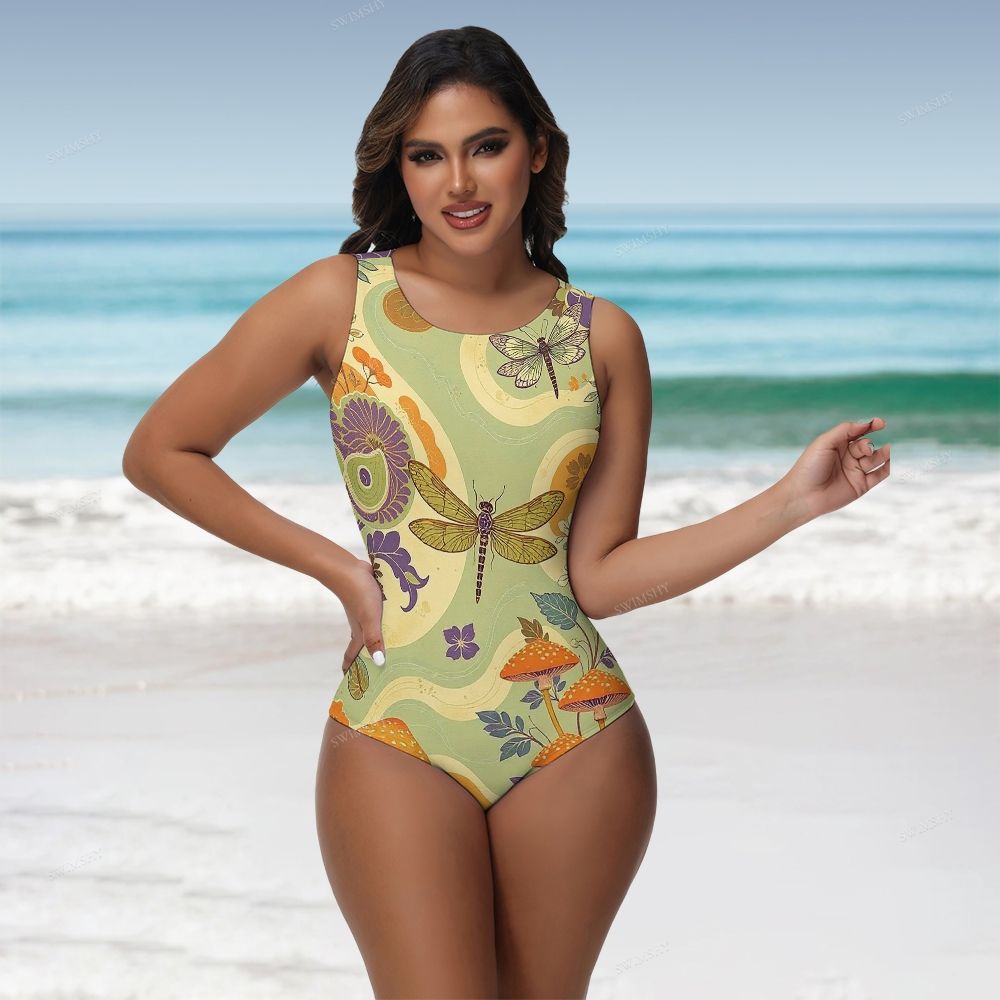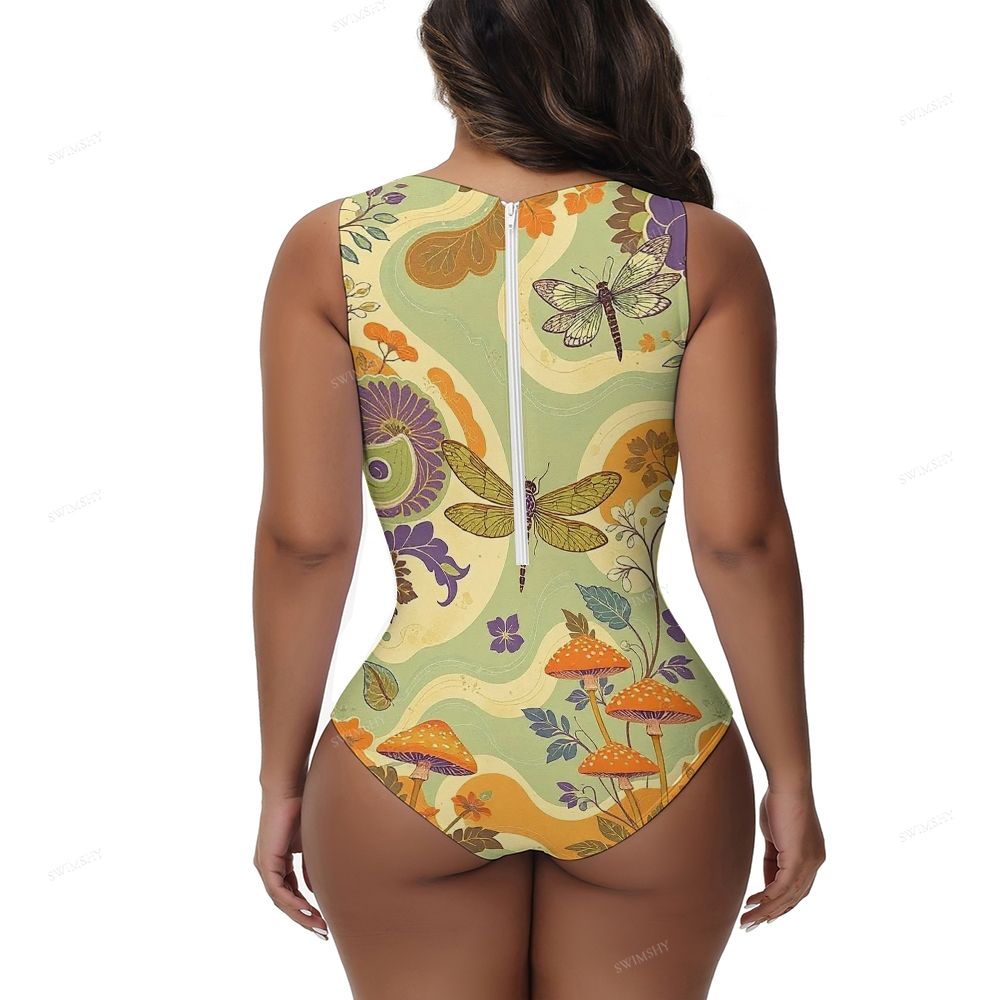 Dragonfly Mushroom Retro Zip One Piece Swimsuit