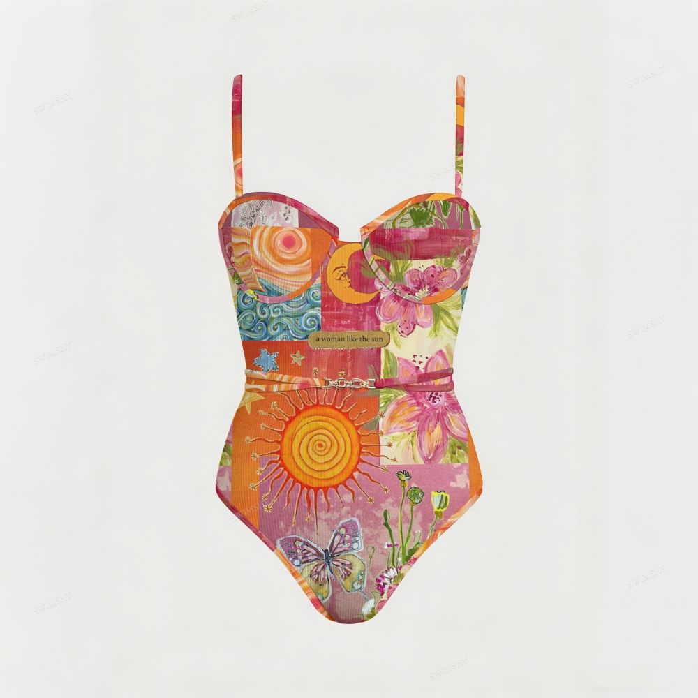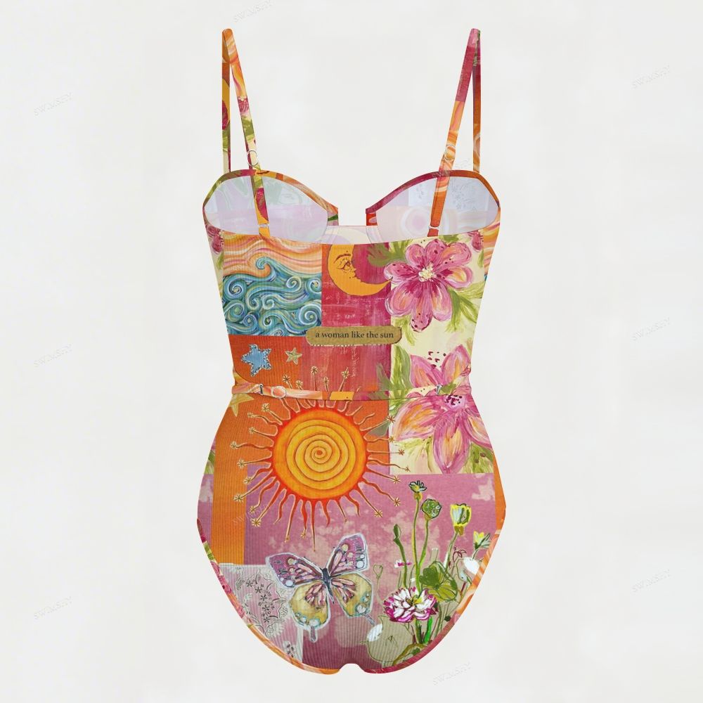 Sun Butterfly Retro Patchwork Belted One Piece Swimsuit