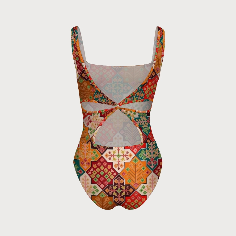 Vintage Contrast Geo Floral Square Neck Cutout One Piece Swimsuit