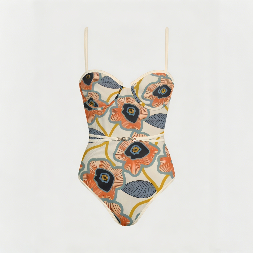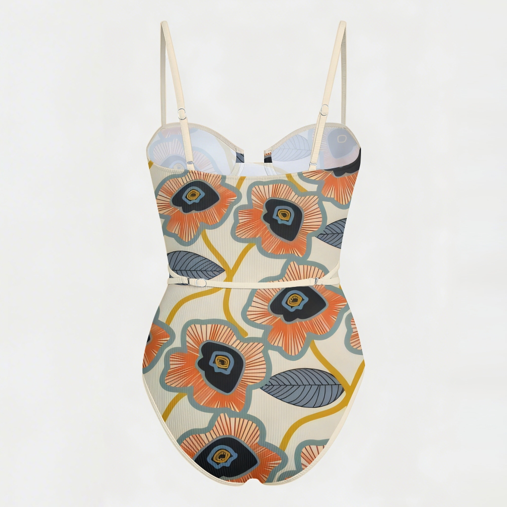 Vintage Geometric Floral Print Strap Waist Tie One Piece Swimsuit