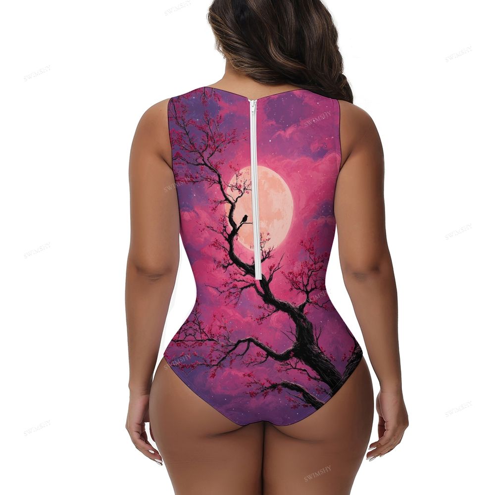 Cherry Blossom Moon Night Print Round Neck Back Zip One Piece Swimsuit
