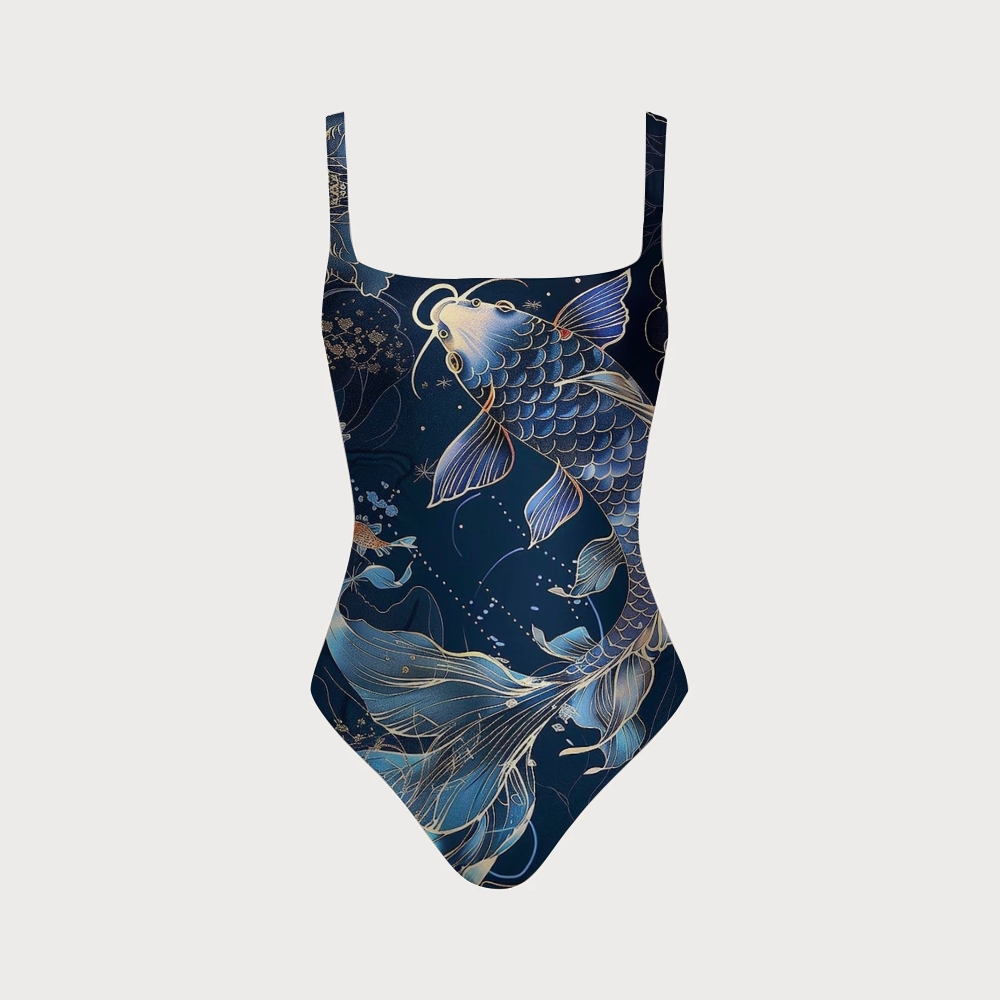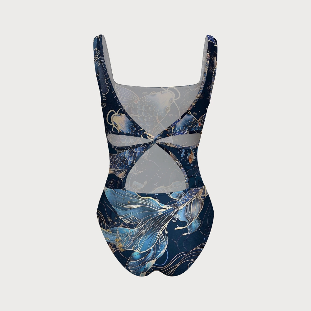 Chinese Koi Print Square Neck Backless One Piece Swimsuit