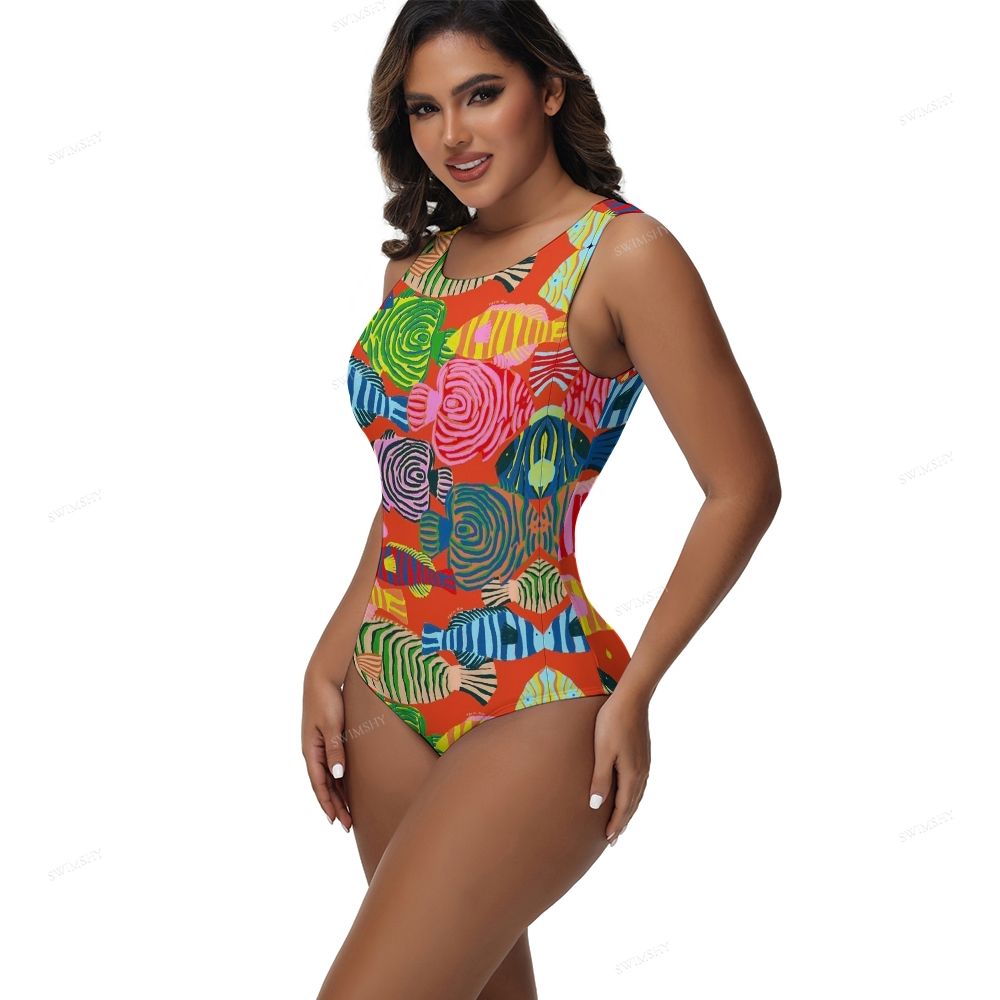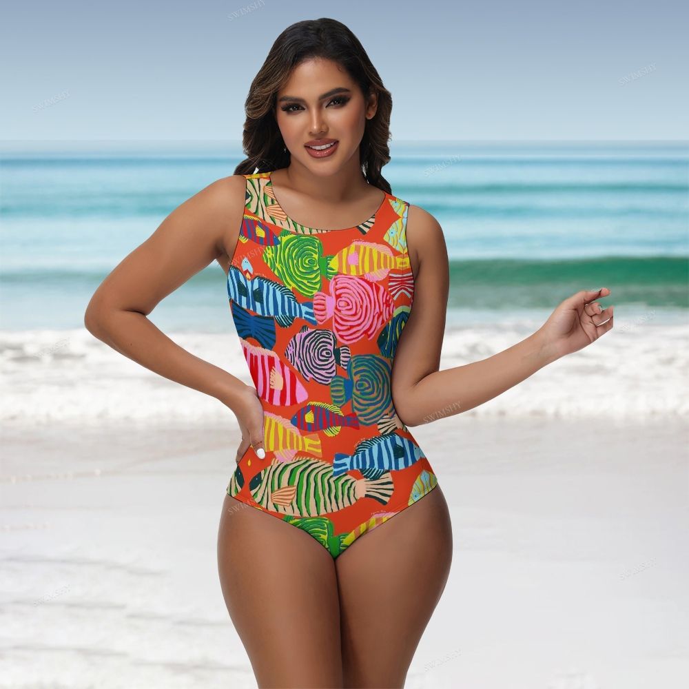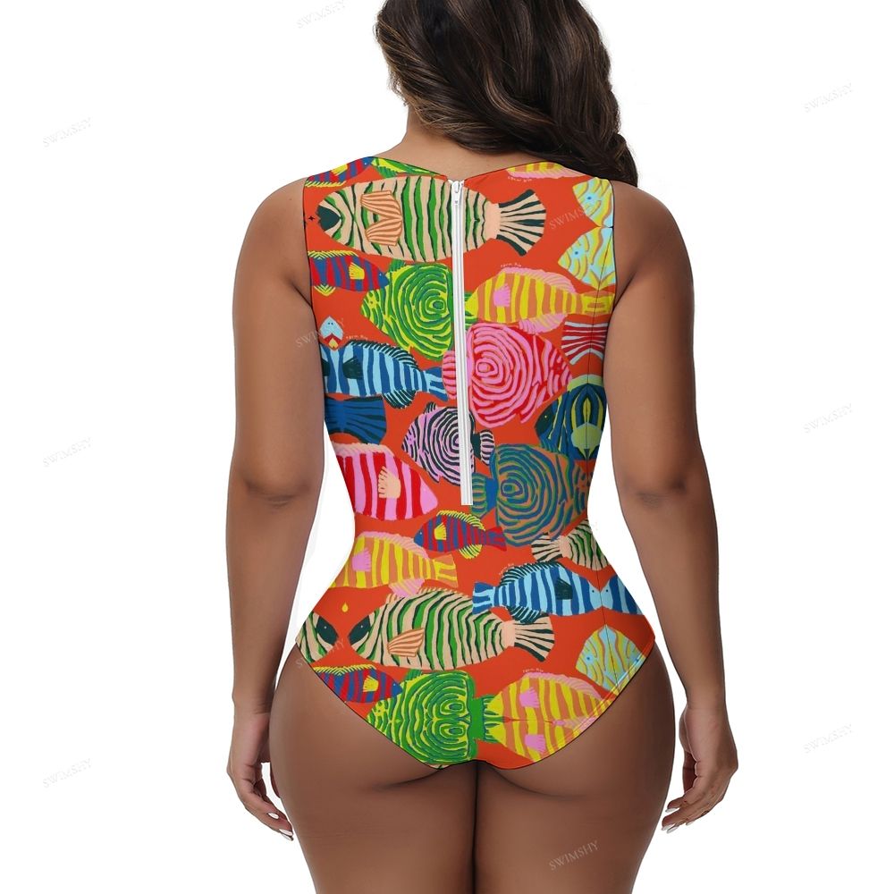 Colorful Tropical Fish Print Round Neck Back Zip One Piece Swimsuit