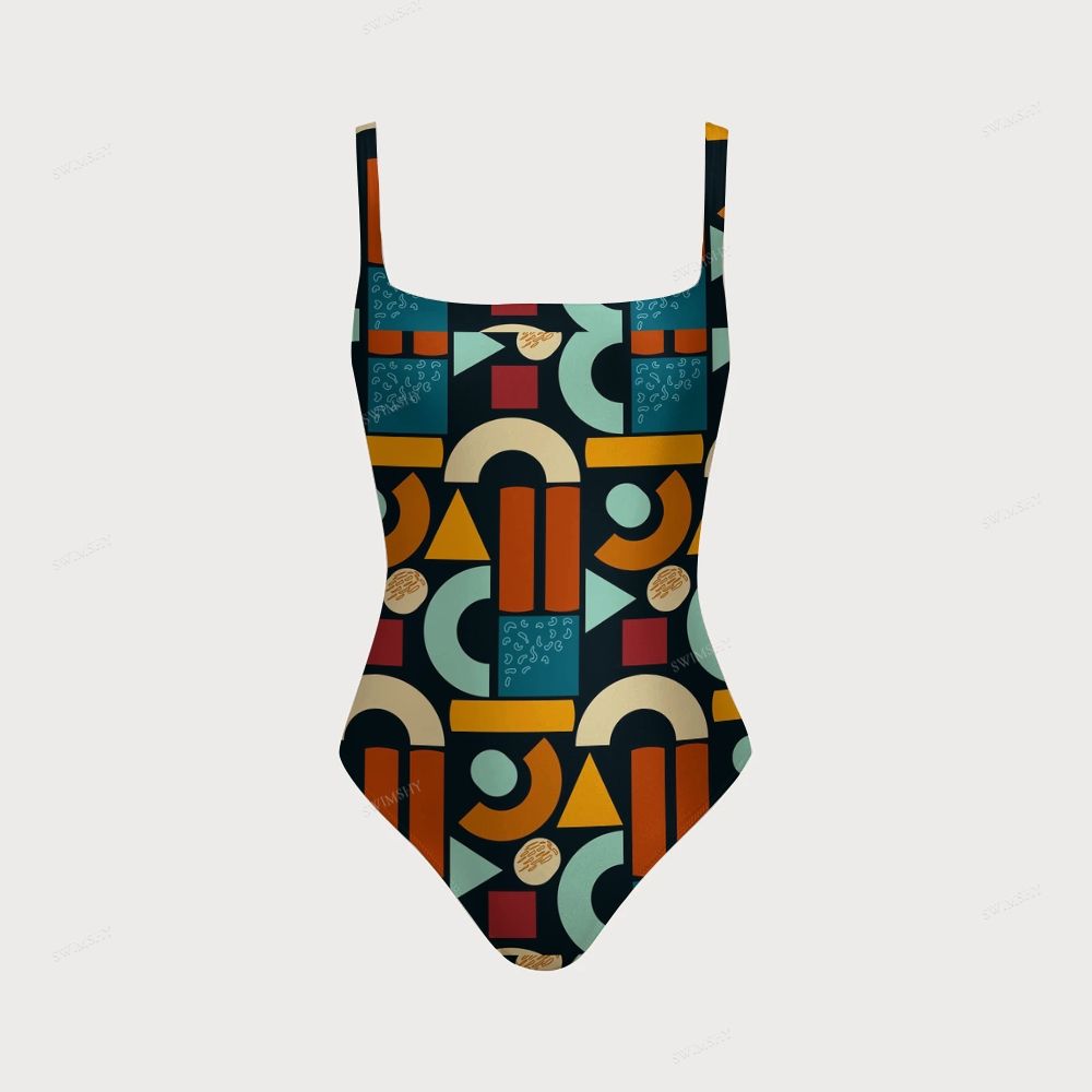 Geometric Abstract Color Block Print Square Neck Cross Backless One Piece Swimsuit
