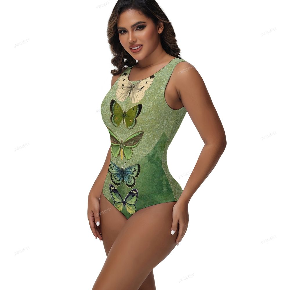 Green Vintage Butterfly Print Round Neck Back Zip One Piece Swimsuit