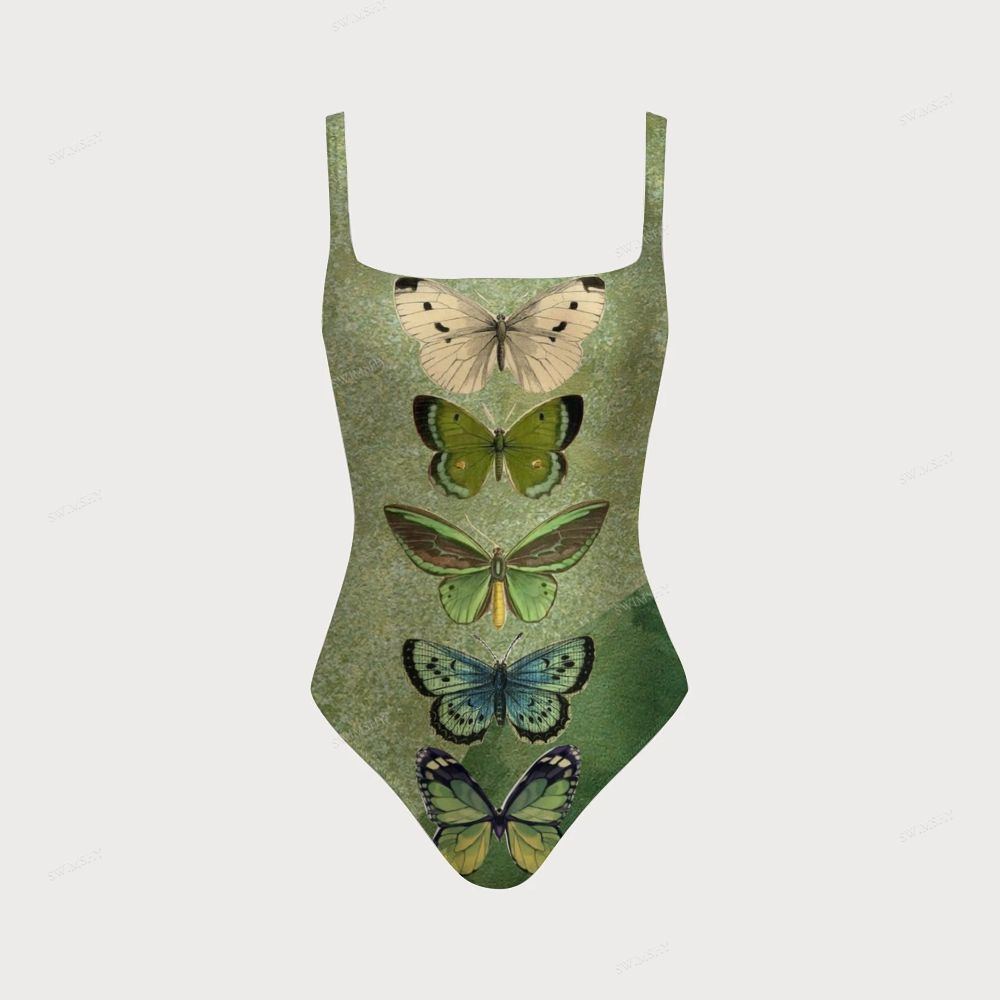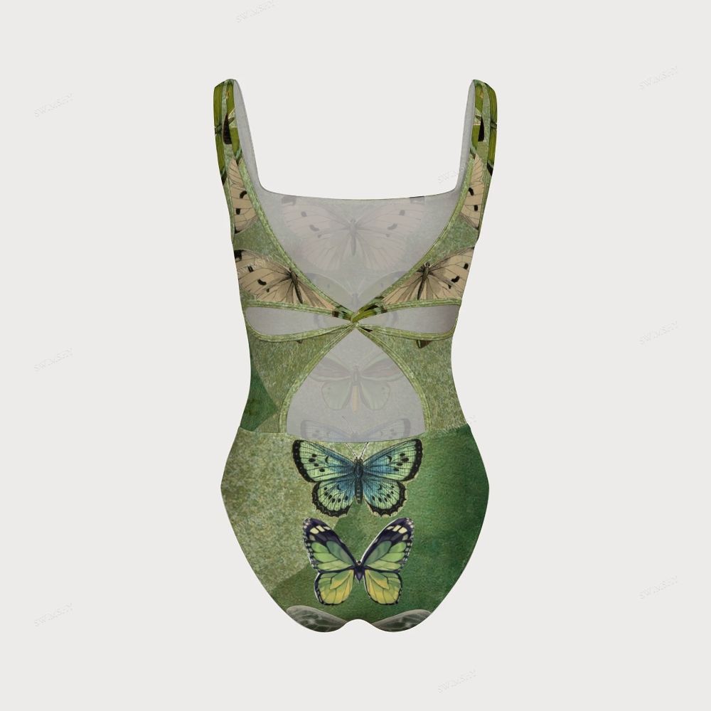 Green Vintage Butterfly Print Square Neck Cross Backless One Piece Swimsuit