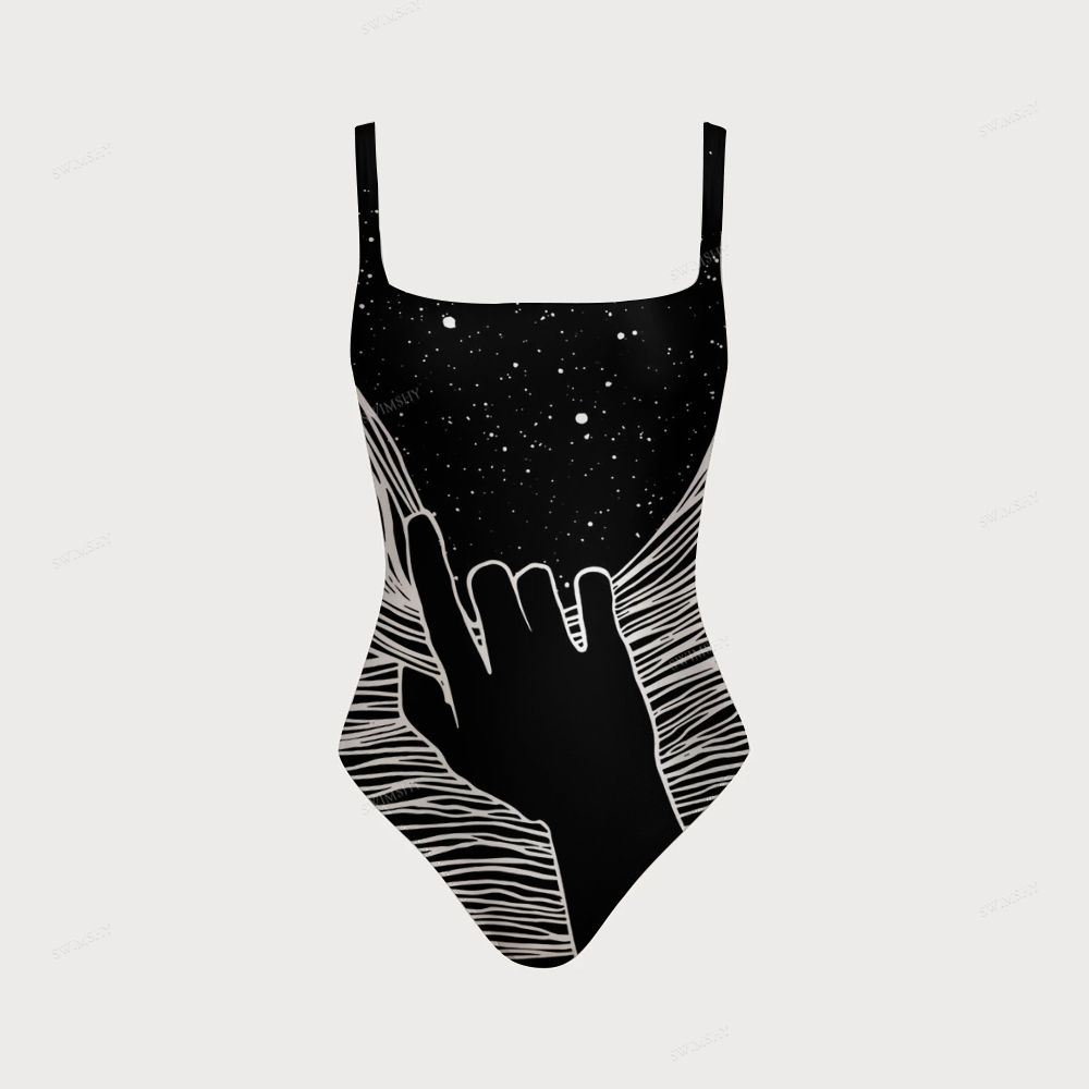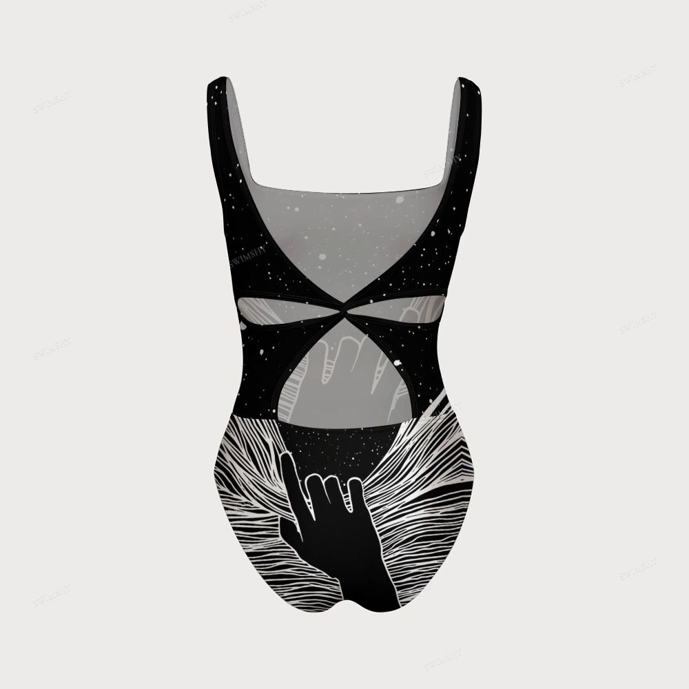 Hand & Starry Sky Art Print Square Neck Cross Backless One Piece Swimsuit