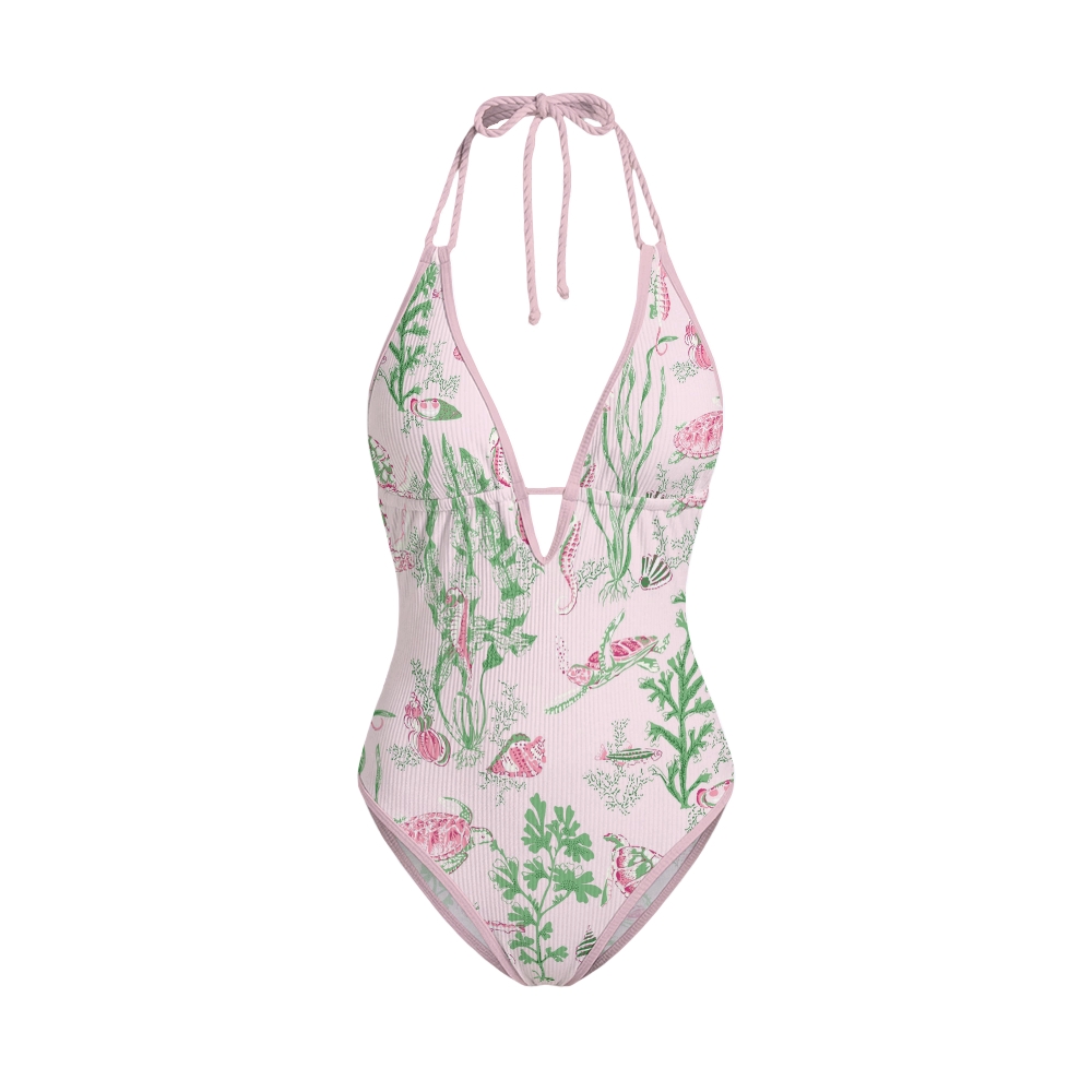 Marine Turtle Seaweed Print Halter Deep V Backless One Piece Swimsuit